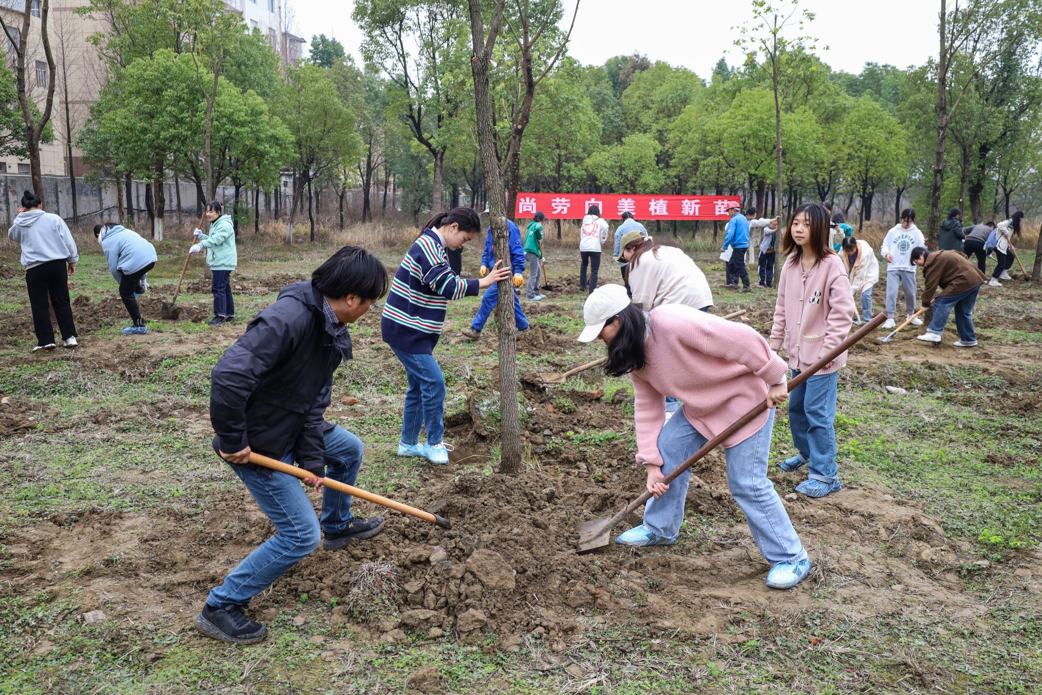 学校开展“尚劳向美植新苗”特色劳动实践课,旨在引导广大师生进一步贯彻落实党的二十大精神和习近平总书记的重要指示批示精神,牢固树立绿色发展理念,推动国土绿化行动。该实践课从2023年3月持续到6月,首次将“种树”和“育树”结合,通过“第二课堂”组织学生4人一组在校内寻找种植树苗位置,上报种植树苗种类。新茵园林结合校园规划和栽种地实际情况,形成栽种计划,指导学生悬挂小组姓名牌,所栽树苗由对应的植树小组协同园林师傅共同负责后续养护工作,直至树苗能够稳定生长。
