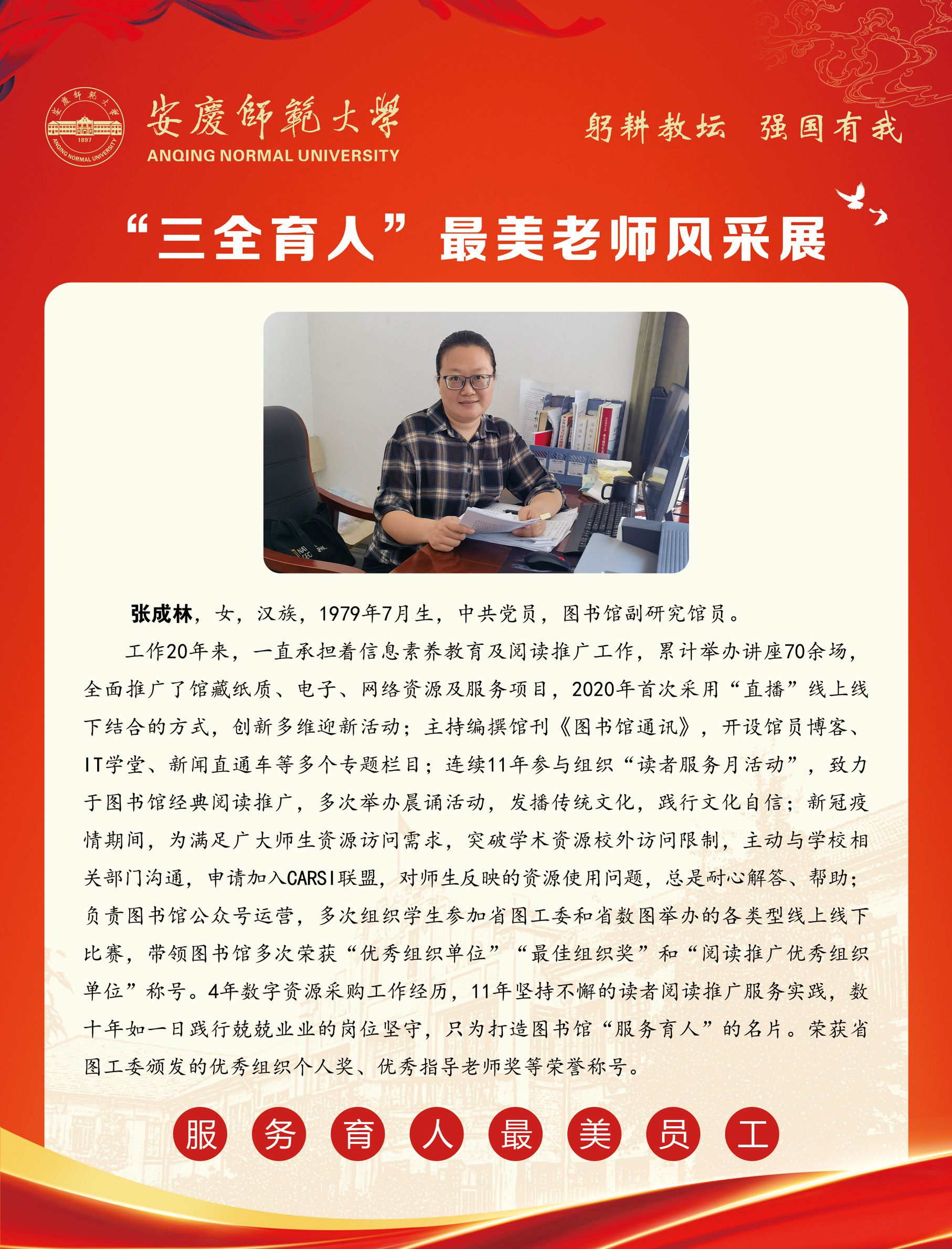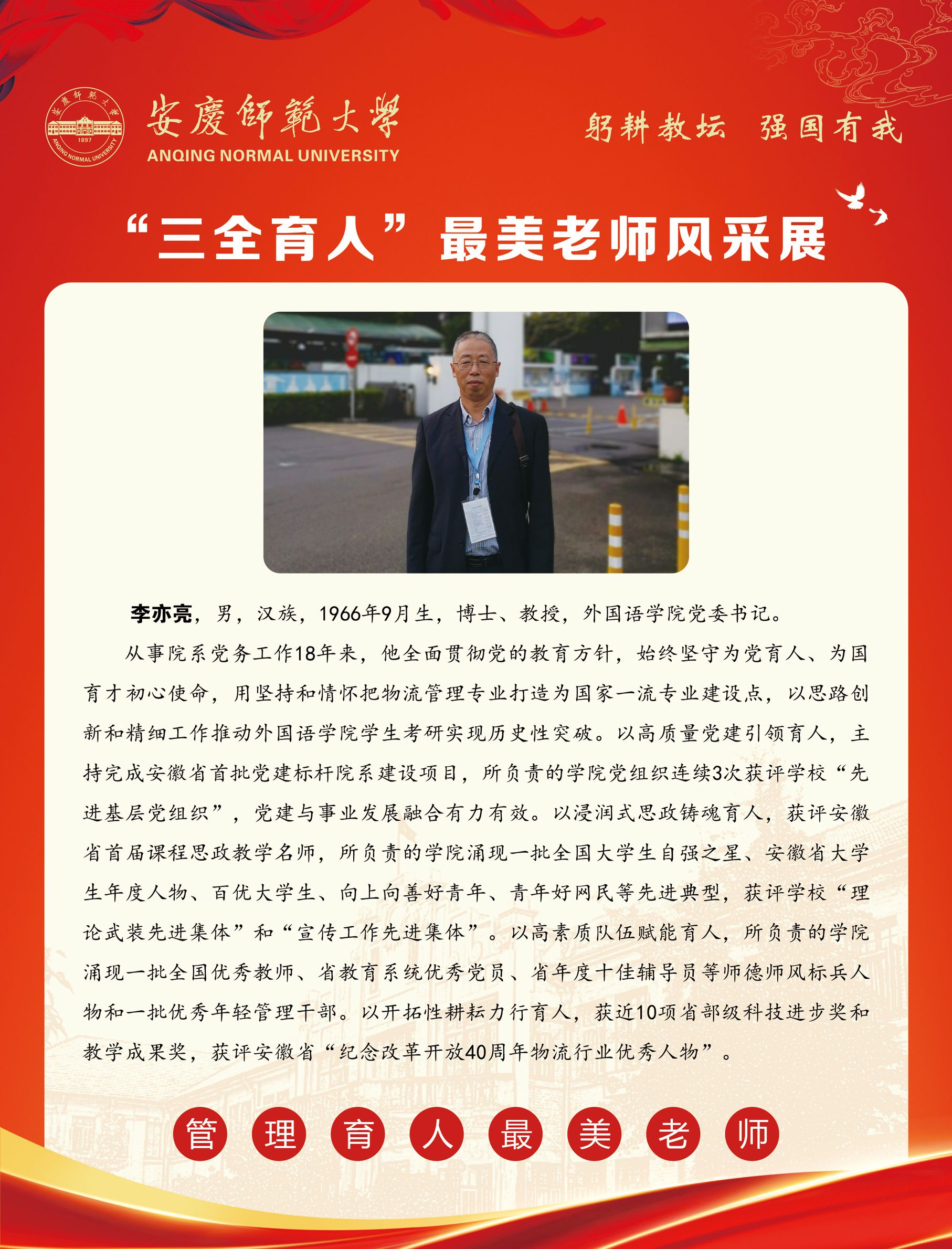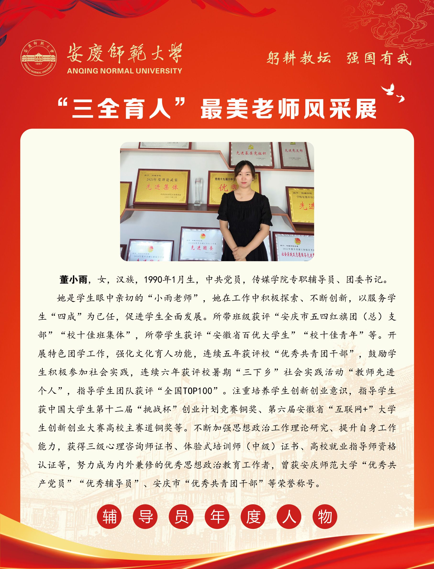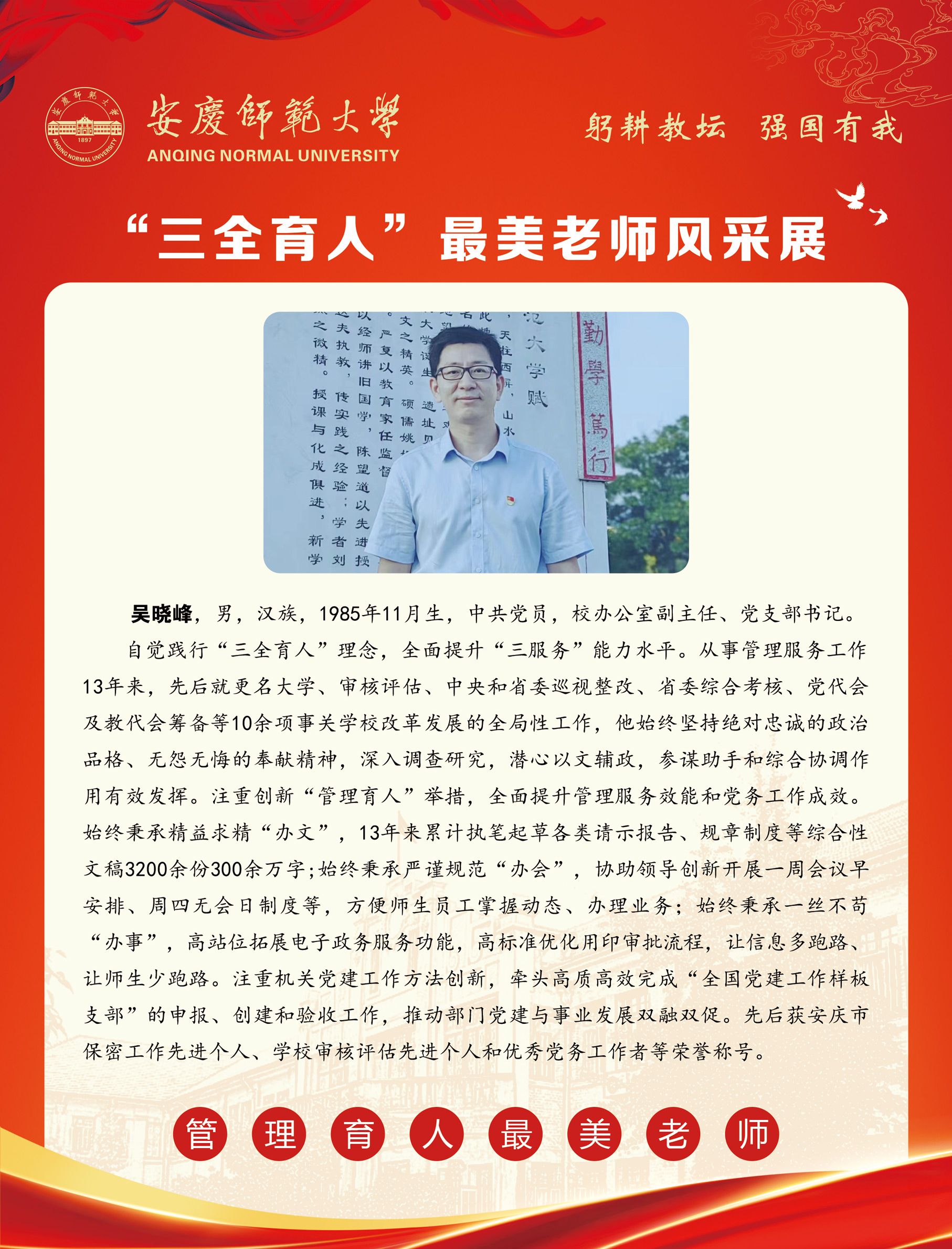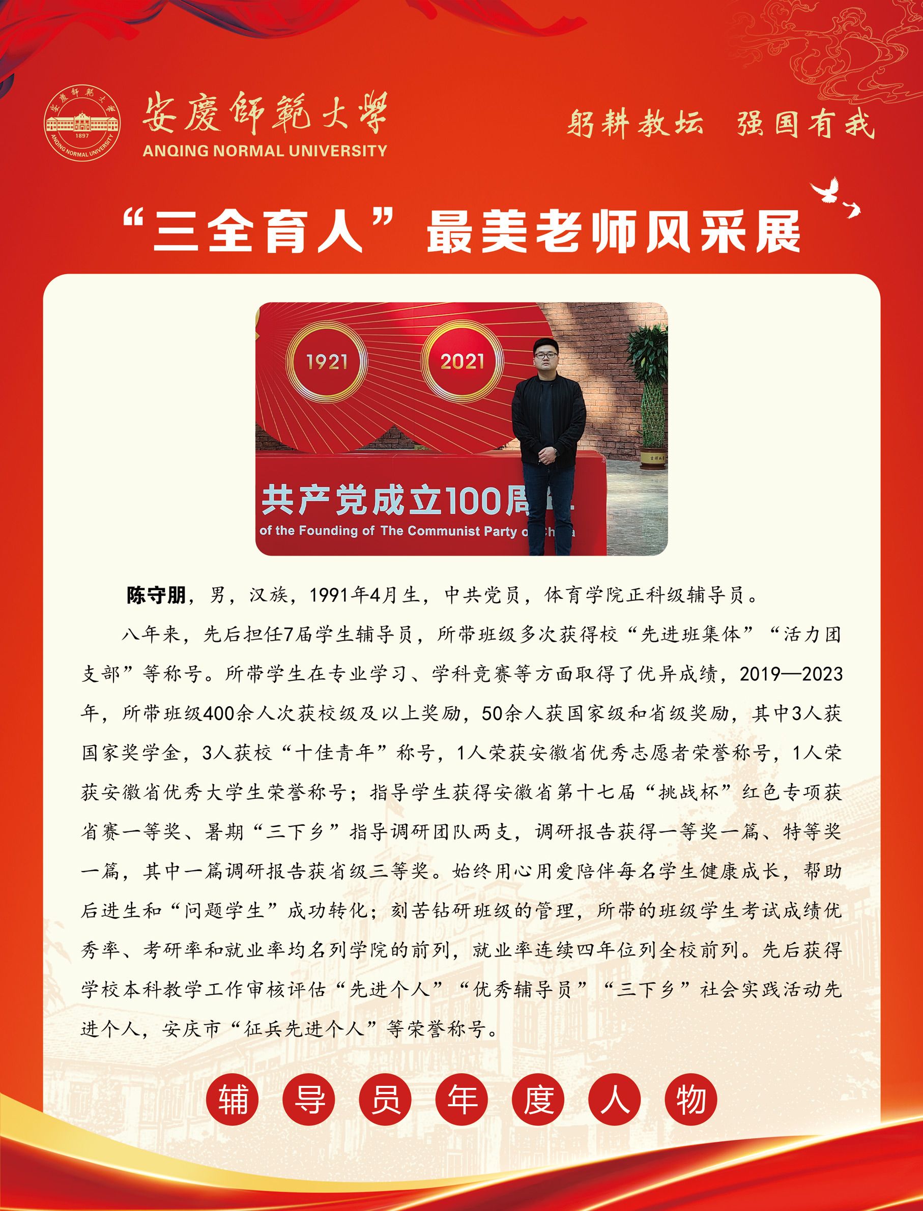 编者按:为大力弘扬尊师重教的良好风尚,进一步增强beat365广大教师和教育工作者的荣誉感、责任感,激励beat365教师和教育工作者牢固树立“躬耕教坛,强国有我”的志向与抱负,做“四有好老师”,当好“四个引路人”,近期,学校设立【“三全育人”最美老师】专栏,对2022-2023学年“三全育人”最美老师的先进事迹进行集中展示。
