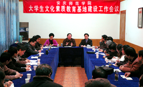 汪青松院长对大学生文化素质教育基地建设作出重要指示。他指出大学生文化素质教育基地申报成功来之不易,对各个部门所做的工作和付出的努力表示感谢。他认为今天的会议既是对前期工作的总结会,是对2007年基地建设工作的布置会,又是成果展示会。抓好这项工作,意义深远。他强调必须要做到五点:第一,抓好总结和考核。要求与会同志会后做好自我总结和方案策划工作。要大张旗鼓表彰为基地建设工作作出重要贡献的部门和个人。第二,按照四个“三”要求开展工作。坚持三个“以”的指导思想,遵循“三结合”的工作思路,探索“三大工程”建设的模式,坚定“三提高”的工作目标。第三,落实和实施好工作计划,创新工作机制。要用“周工作法”、“要素工作法”,“规范工作法”,一步一步抓到位。第四,加强组织建设。根据工作需要,调整机构,落实基地办公场所。第五,加强校内外交流,多出系列精品。