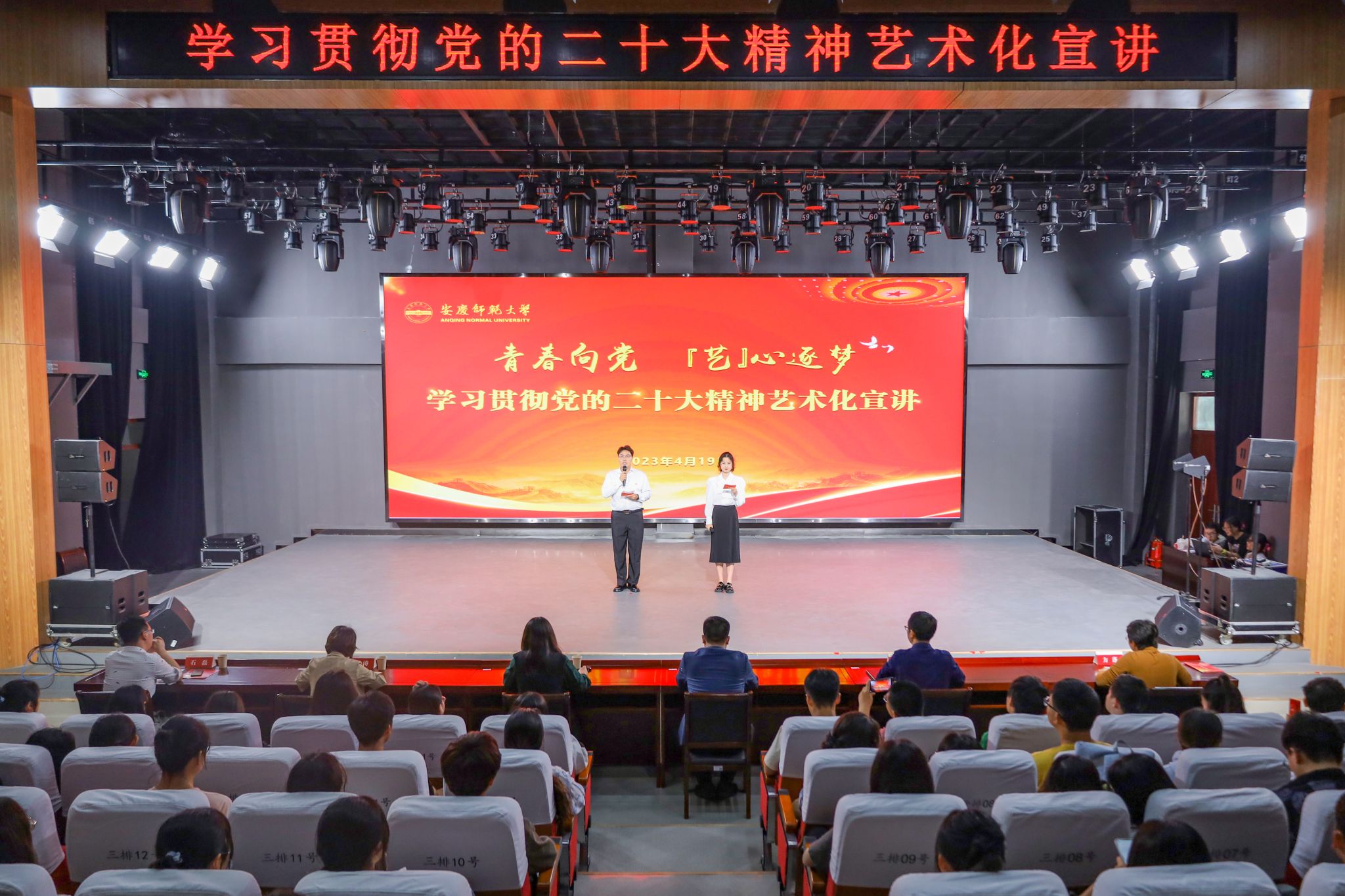 本次宣讲以“青春向党 艺心逐梦”为主题,以学习贯彻党的二十大精神为主线,通过朗诵、歌曲、舞蹈、戏曲、器乐演奏等师生喜闻乐见的多种艺术表演形式,生动展现了百年来一代代青年紧跟党走的青春身影,为师生呈现了一幅幅真实有力、饱满励志的青年奋斗者群像,激励广大青年牢记习近平总书记在党的二十大报告中对青年的殷切嘱托,立志做有理想、敢担当、能吃苦、肯奋斗的新时代好青年。校“青年新声”宣讲团宣讲员、马克思主义理论专业2022级研究生李宝鑫、施敏担任宣讲人。