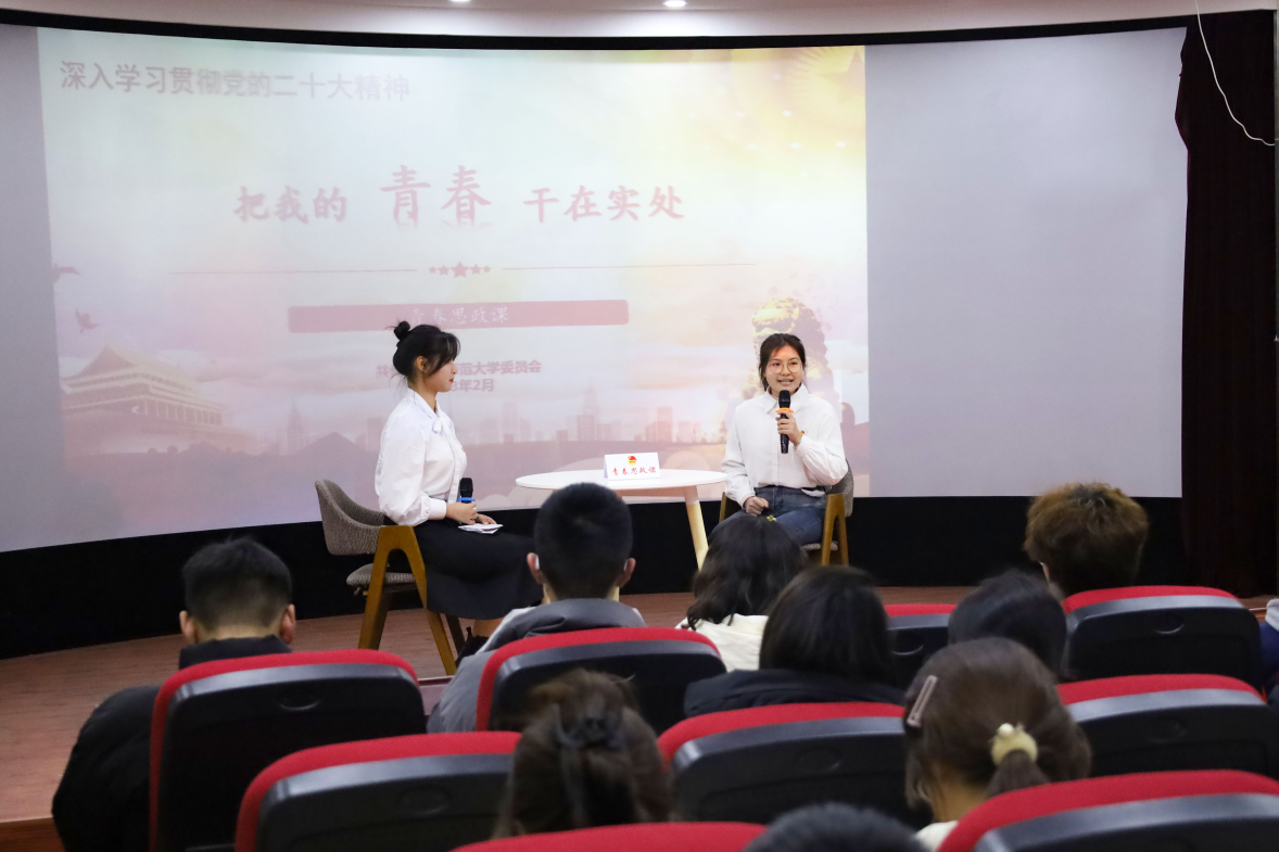 “今天的青春思政课,让我很有感触。党的二十大报告指出‘青年强,则国家强’,一代代青年们正是用爱国奉献、实干笃行的精神,才筑牢了强国之基。作为学生,我们更要在知行合一中主动担当,从身边的点滴做起,把青春干在实处,才能有底气地发出‘请党放心,强国有我’的誓言。”应用统计学2022级1班团支部书记张静怡表示。