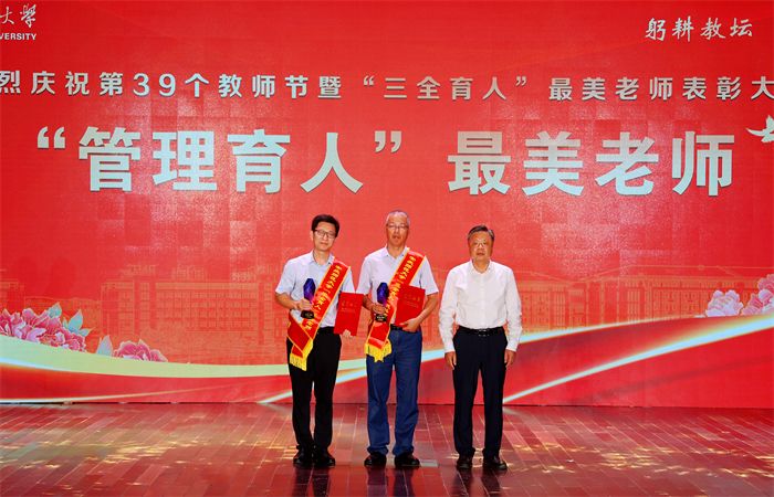 9月8日,学校在龙山校区音乐厅举行庆祝第39个教师节暨“三全育人”最美老师表彰大会。校党政领导许继荣、彭凤莲、崔明、刘友忠、肖新、秦朗、陈秀、张红飞、计裕人出席大会。全体获奖教师、“天柱学者”“龙山英才”受聘教师和师生代表欢聚一堂,共同庆祝第39个教师节。