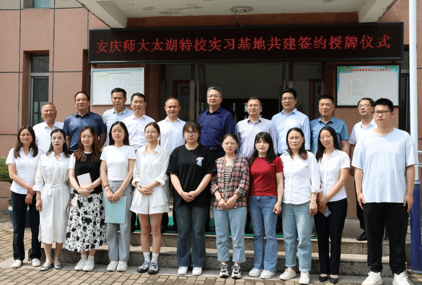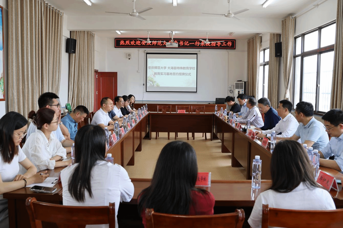 李福华一行到太湖县特殊教育学校,看望慰问正在该校顶岗支教的教师教育学院特殊教育专业李诺等6位同学,并出席beat365教育实习基地签约授牌仪式。仪式由太湖县委副书记杨杰主持,太湖县乡村振兴局、教育局和特殊教育学校相关负责人参加仪式。