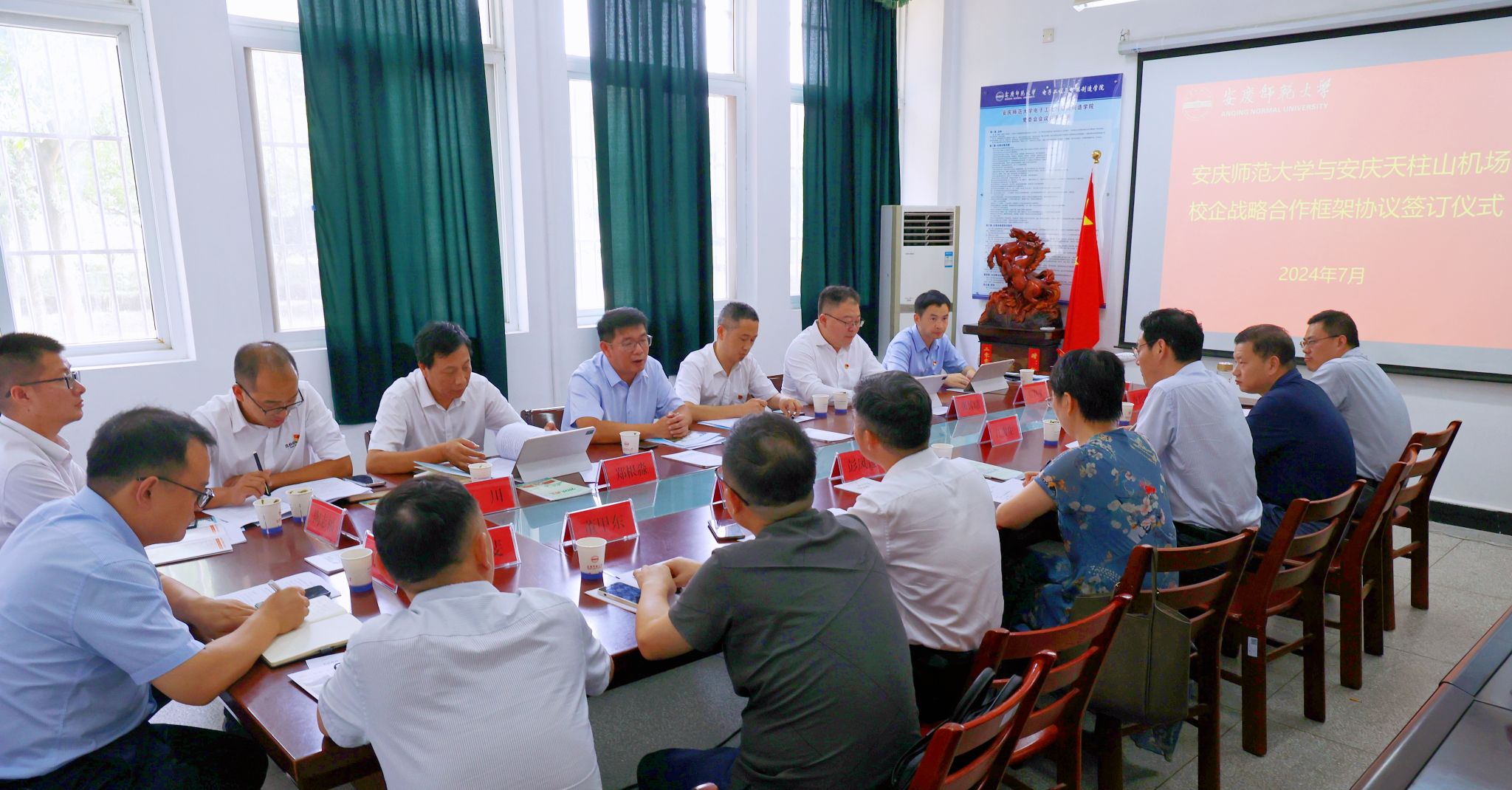 7月17日,安庆天柱山机场有限责任公司董事长刘善斌一行来校调研考察。校长彭凤莲出席座谈会,校党委常委、副校长申传胜主持会议。
