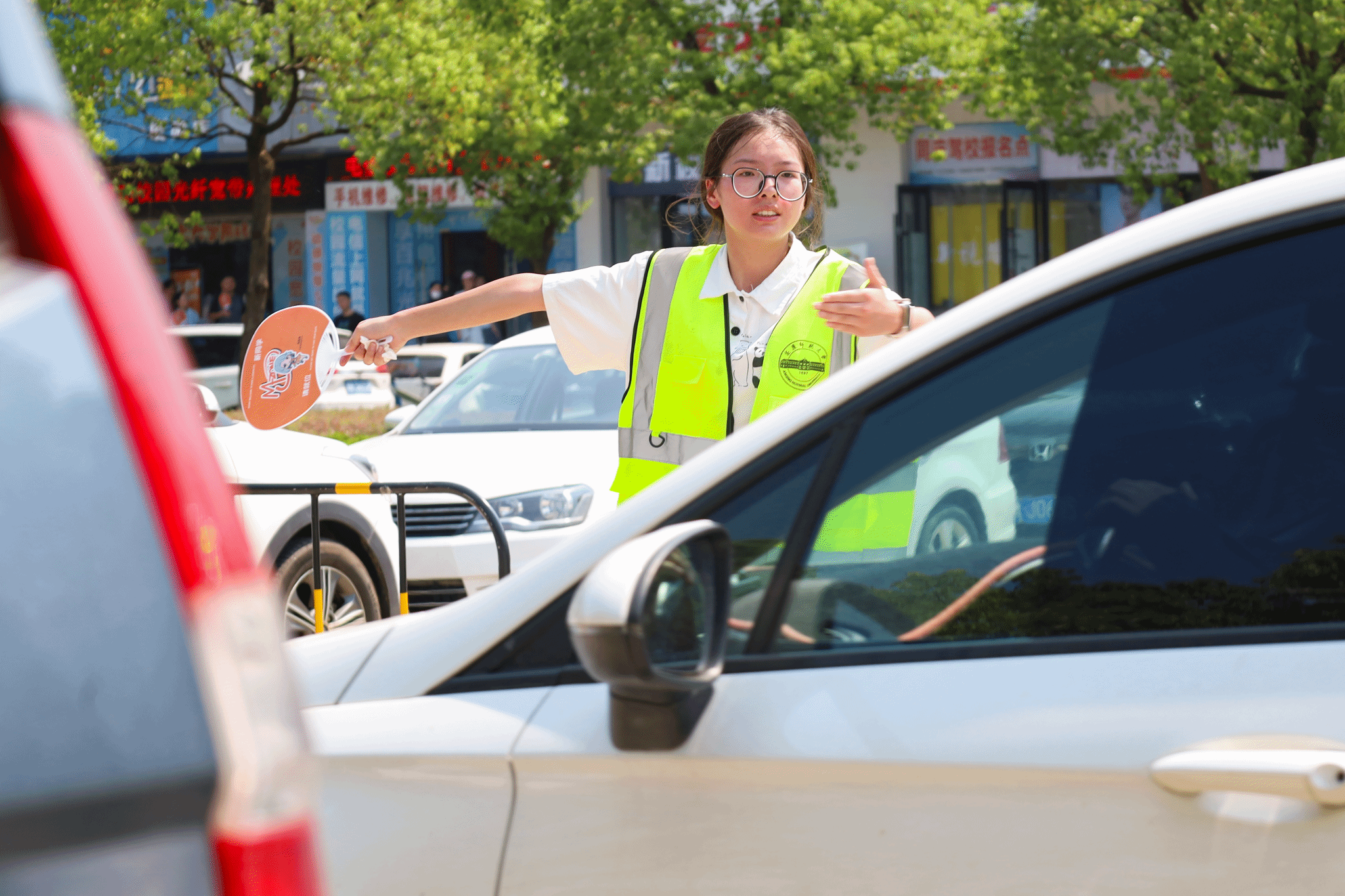 在学校的各主要路口,还能看到一群穿着绿马甲的志愿者,他们和校安全管理处的工作人员一起,协助引导校内交通秩序,“除了校内循环班车外,还有不少新生家长选择自驾送孩子来校,为避免拥堵,我们在学校各个路口值守,为汽车通行指路、疏散。”音乐学专业2021级(3)班陶涵表示,这也是他第三次参加迎新志愿服务,“虽然很热、很晒、很累,但很有意义。”