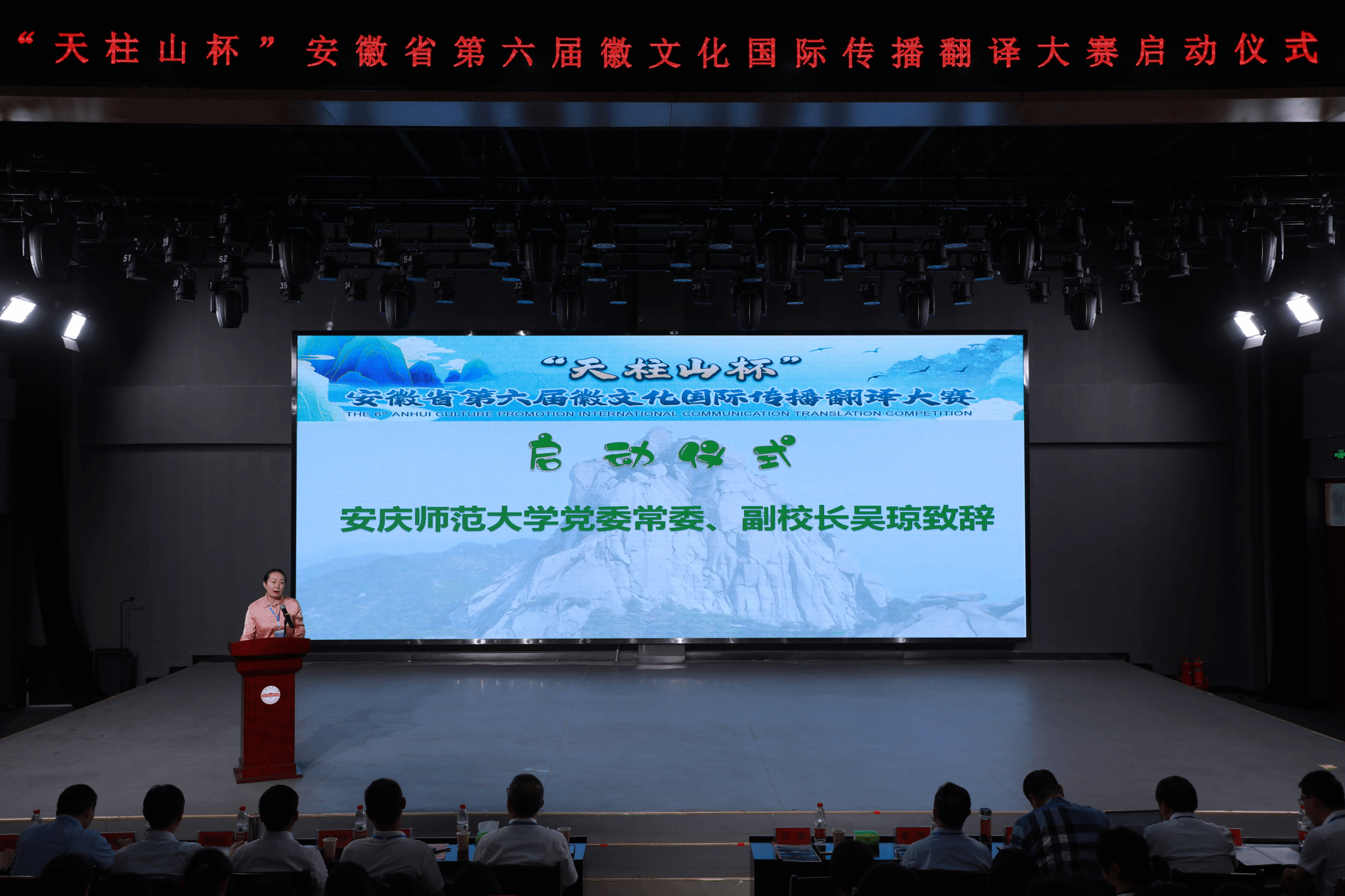 9月21日,“天柱山杯”第六届徽文化国际传播翻译大赛启动仪式在beat365举行。校党委常委、副校长吴琼出席仪式并致辞。大赛主办方、承办方、冠名单位和技术支持单位、安徽省翻译协会部分会员单位负责人,beat365英国官方网站外国语学院班子成员、教师和学生代表200余人参加仪式。