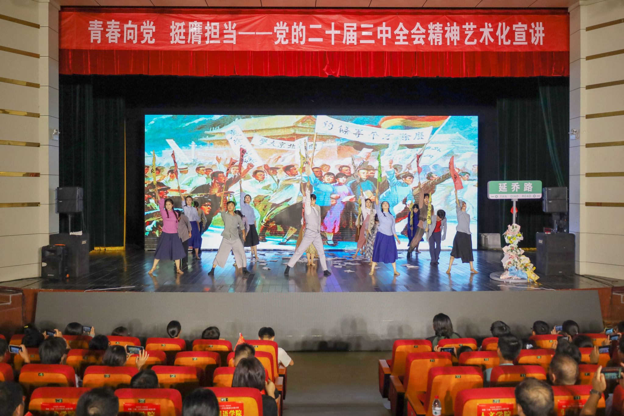 跨越百年时空,不同时代的青年人进行了一场特殊的青春“对话”。舞蹈《延乔路上》以纪念陈延年、陈乔年兄弟二人而命名的延乔路为线索,生动展现了兄弟二人为革命事业而奋发苦读、探索救国路线、宁死不跪的感人事迹。“我看到同学们在台上手持报纸宣传新思想、手举旗帜坚持斗争,深受感动、深受教育。”应用心理学专业2024级的魏紫艳表示,“作为青年大学生,要深入了解、学习延乔兄弟的革命事迹,努力成长为堪当民族复兴重任的时代新人。”