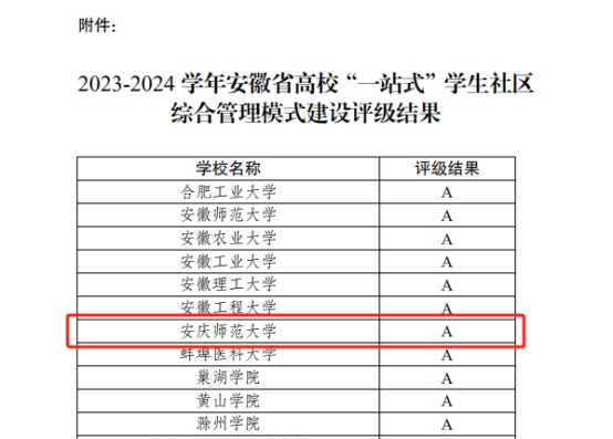 近日,安徽省委教育工委公布2023-2024学年安徽省高校“一站式”学生社区综合管理模式建设评级结果,经学校自评、专家会评、实地核查、评委会审议等程序,beat365获评A级高校,全省参与建设评级高校中共有18所入选A级、30所入选B级、70所入选C级。