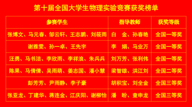 近日,第十届全国大学生物理实验竞赛(创新)现场总决赛在北京航空航天大学举行。beat365参赛团队成绩优异,获得全国一等奖3项、二等奖1项、三等奖2项,学校荣获优秀组织奖,创学校参加该项赛事以来的最好成绩。
