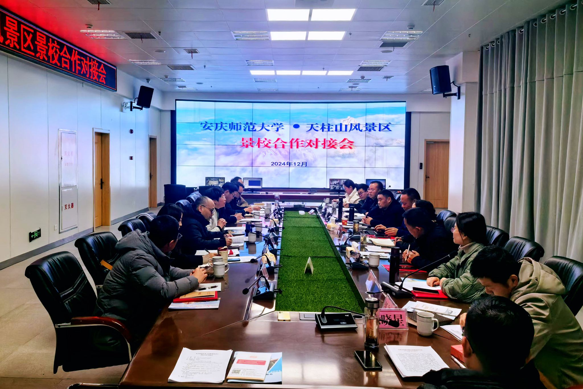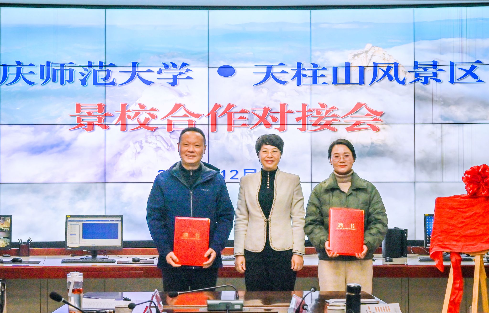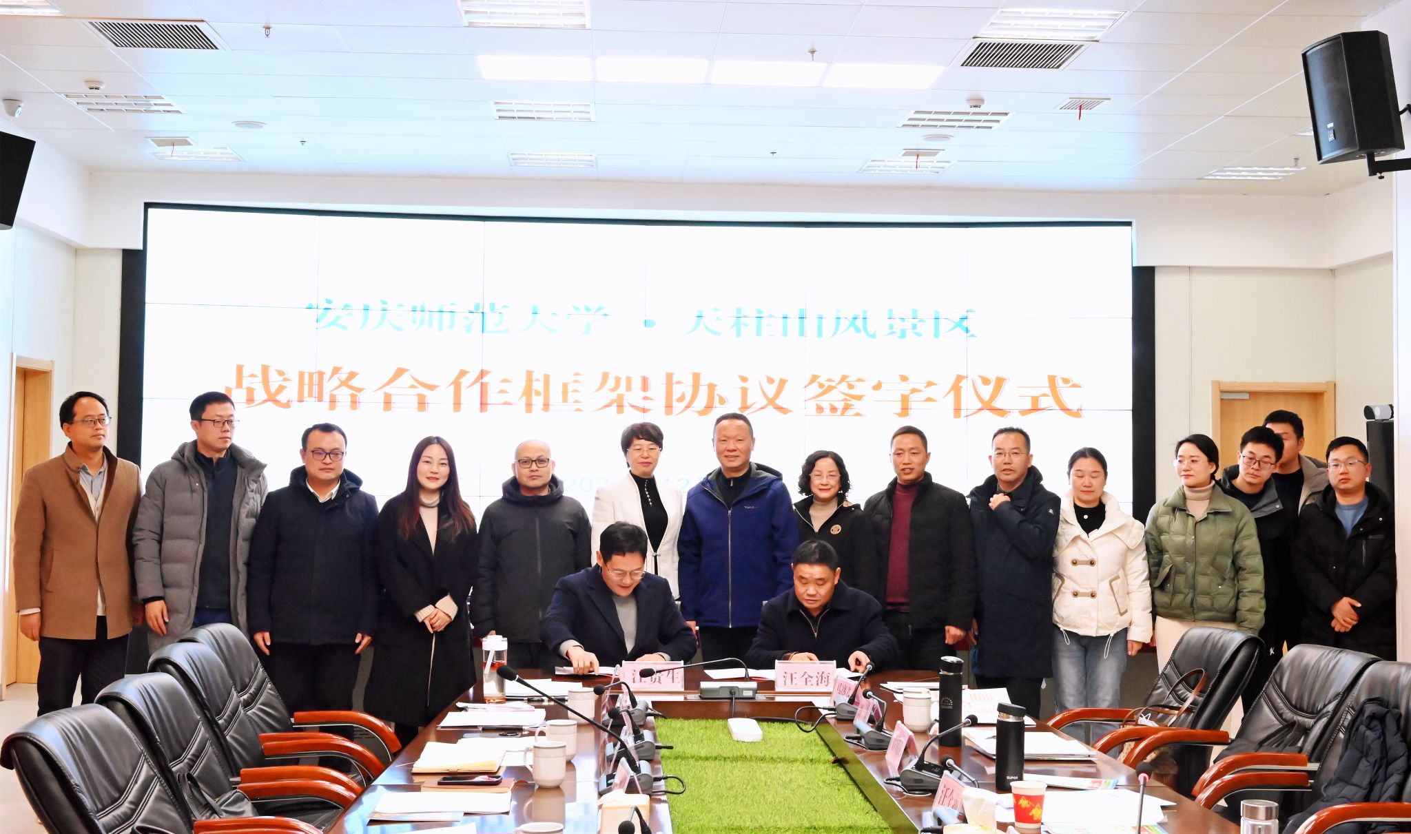 12月18日,校长彭凤莲率队前往天柱山风景名胜区管理委员会就校景合作开展签约仪式和座谈交流。潜山市委常委、天柱山风景区党委副书记、管委会副主任舒寒冰出席活动。服务经济社会发展处、教务处、资源环境学院、音乐学院负责人,天柱山管委会、天柱山文旅集团有关负责人参加对接会。
