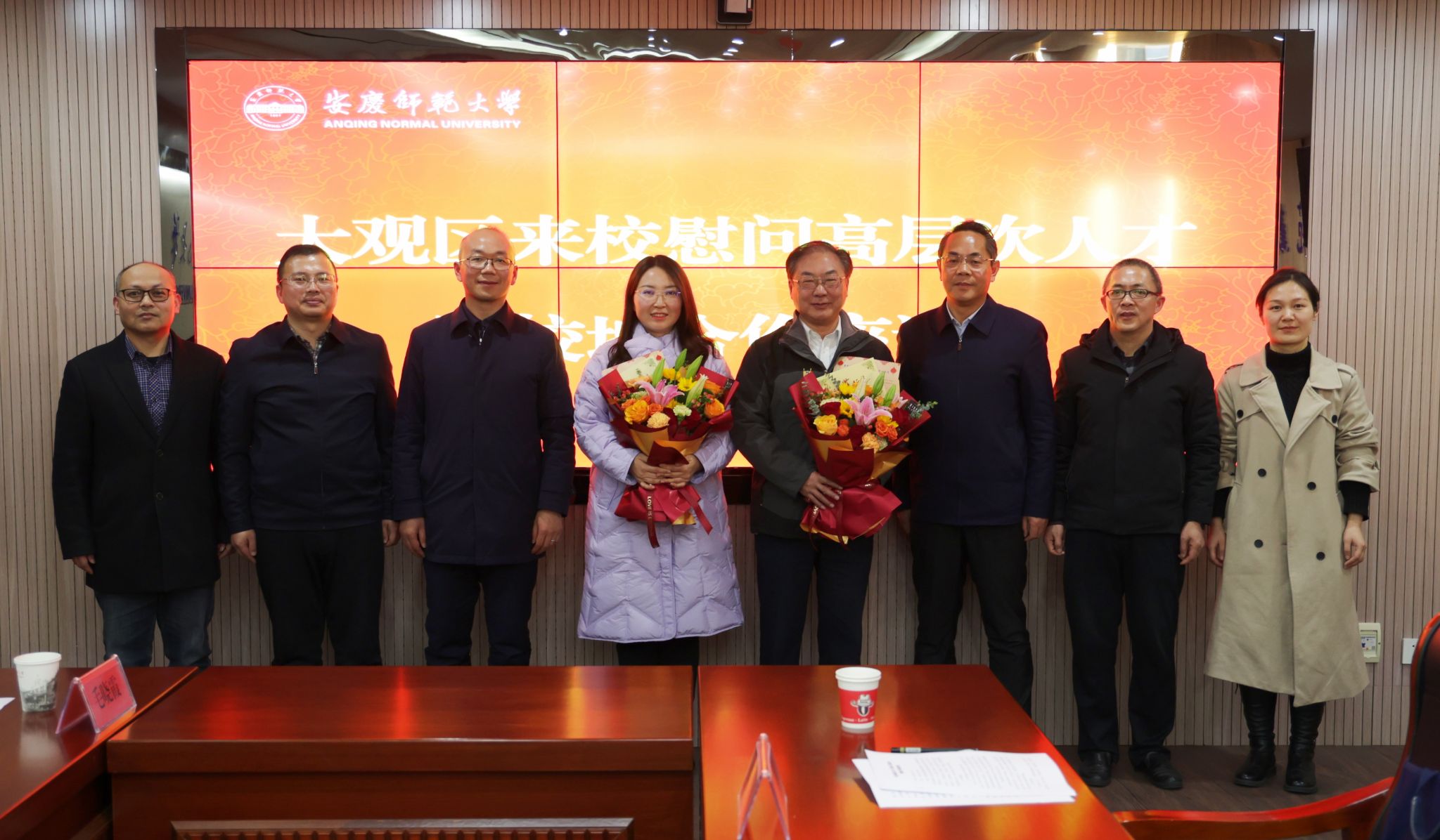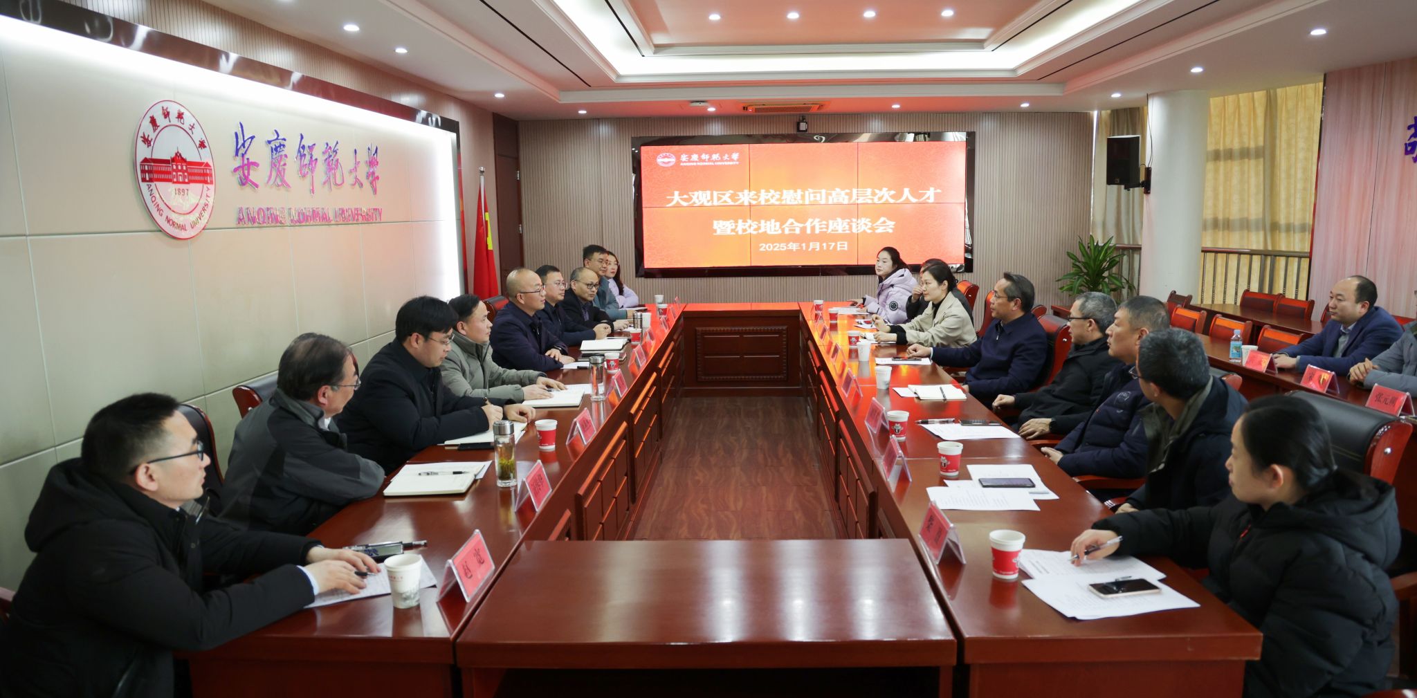 1月17日,安庆市大观区委书记潘功发,区委常委、组织部部长刘小平,区政府副区长储艺一行慰问beat365资源环境学院教授、省级科技特派员创新创业示范基地负责人毛晓霞和经济与管理学院硕士研究生校外导师汪传华,并举行校地合作座谈会。校党委常委、副校长肖新,校党委常委计裕人出席相关活动。