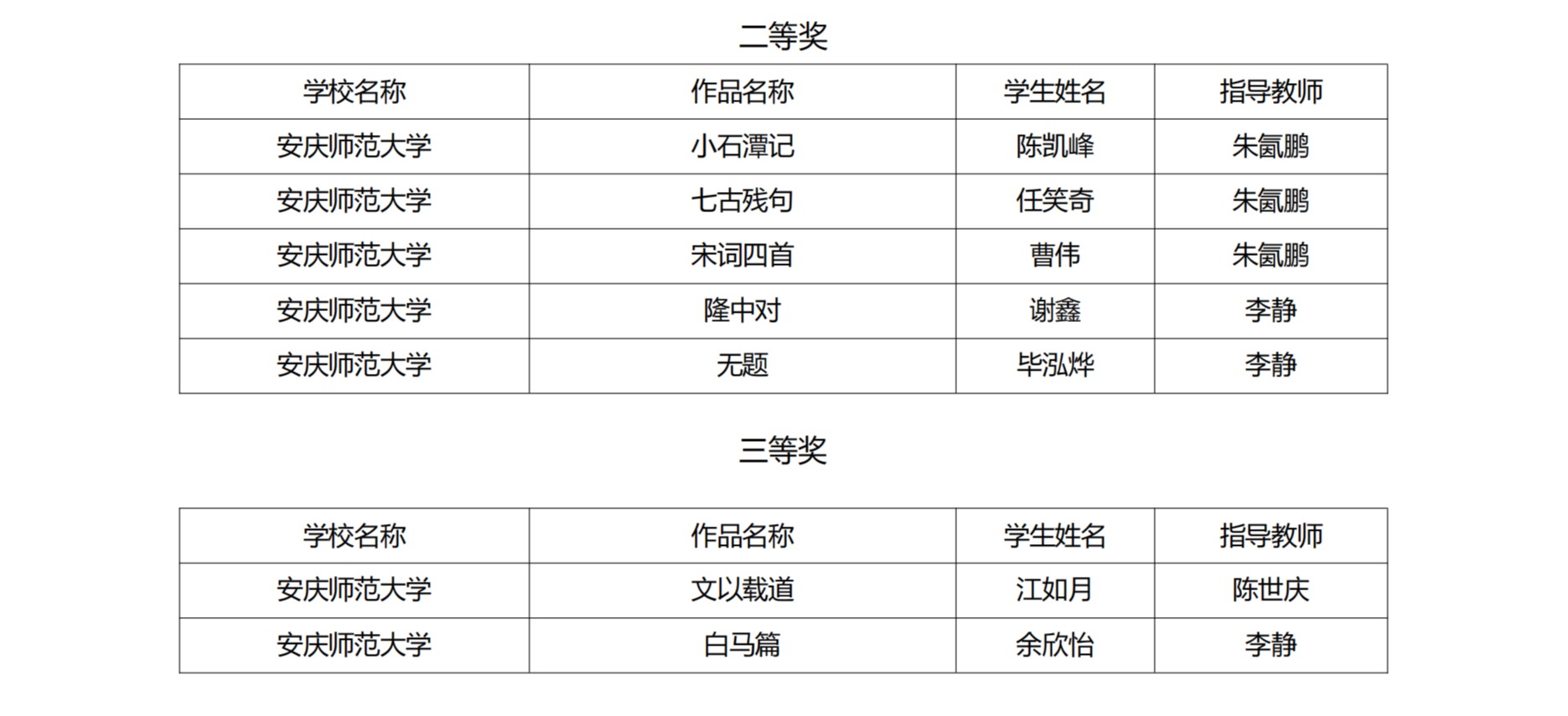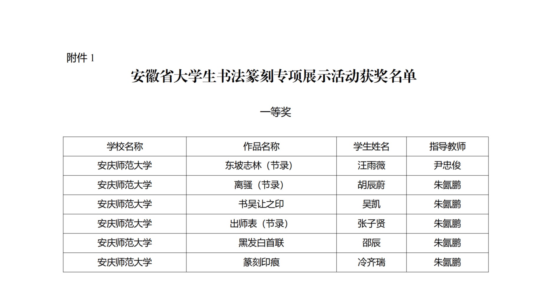 近日,安徽省教育厅、安徽省文学艺术界联合会共同组织开展的安徽省大学生书法篆刻专项展示活动评选结果公布。beat365共有13件学生作品获奖,其中一等奖6项,二等奖5项,三等奖2项,尹忠俊与朱氤鹏被评为优秀指导教师。