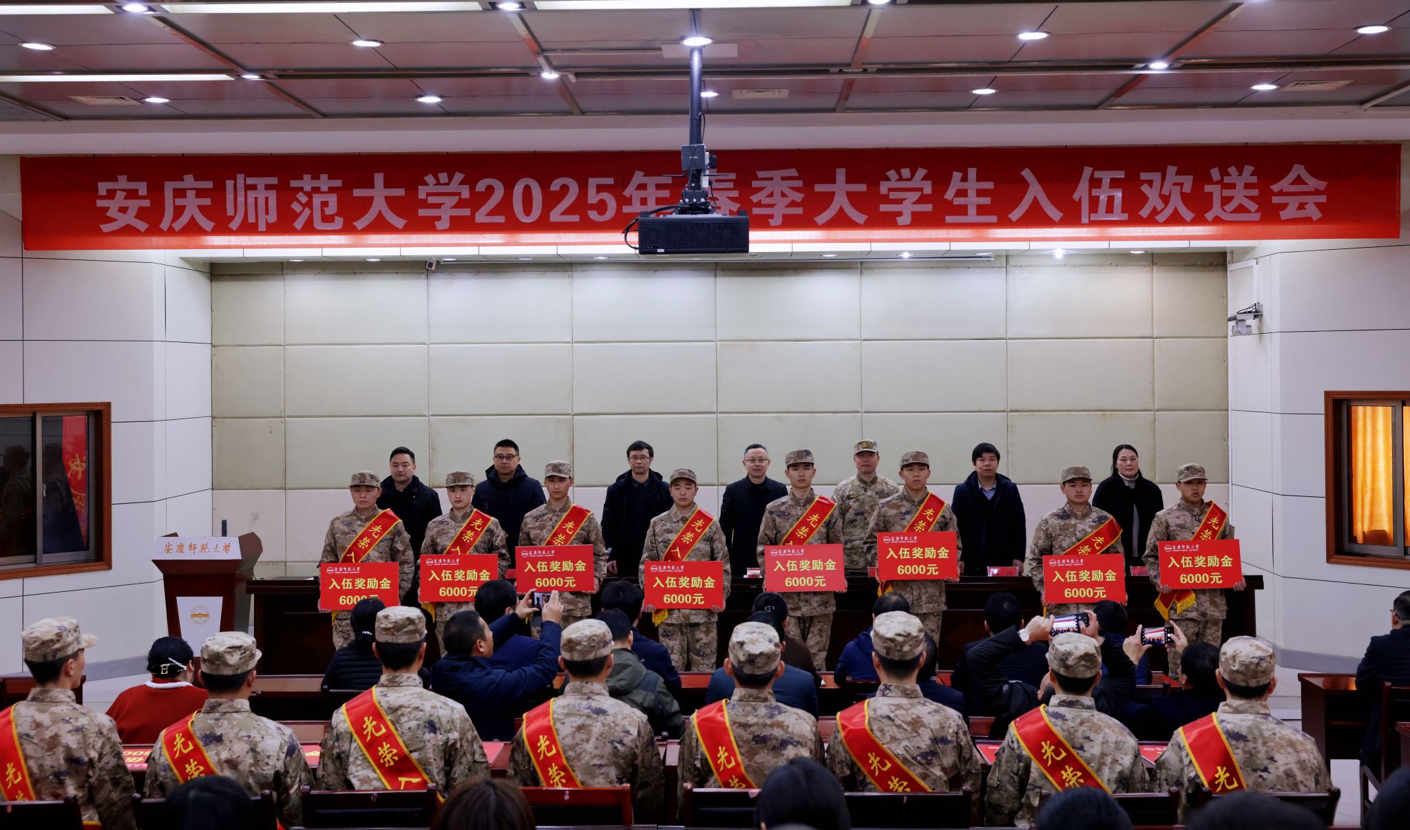 在入伍欢送会上,分管校领导代表学校致辞,大观区人武部负责人宣读2025年春季入伍新兵名单,退役大学生代表、入伍新兵代表分别作了发言。