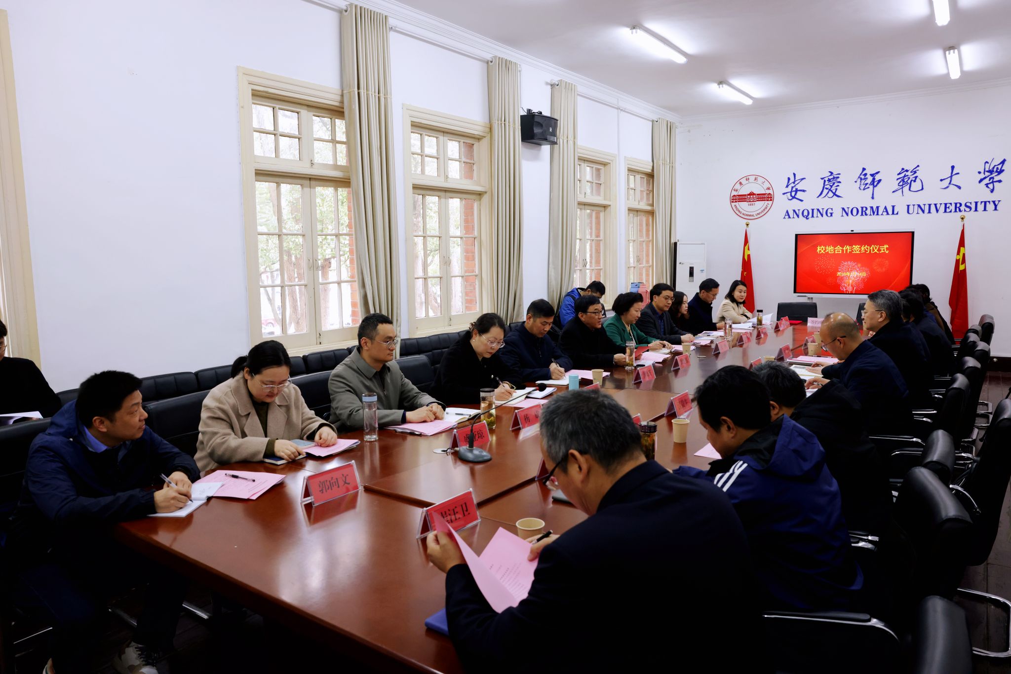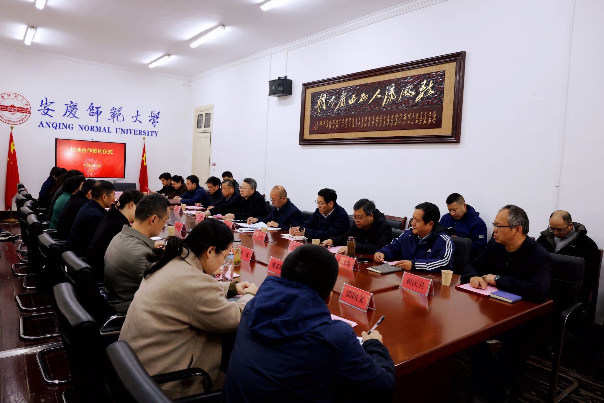 3月14日,学校与安庆市纪委举行战略合作协议签约仪式。校党委书记李福华,安庆市委常委、纪委书记耿延强,校党委常委、纪委书记秦朗出席仪式。仪式由校党委常委、副校长肖新主持。安庆市纪委副书记、监委副主任张帆,纪委常委黄知开、储怡军,纪委有关部门负责人,校纪委办公室、党委巡察办公室、服务经济社会发展处、黄梅剧艺术学院、法学院、计算机与信息学院等单位负责人,特约监察员,专家咨询委员会成员等参加仪式。