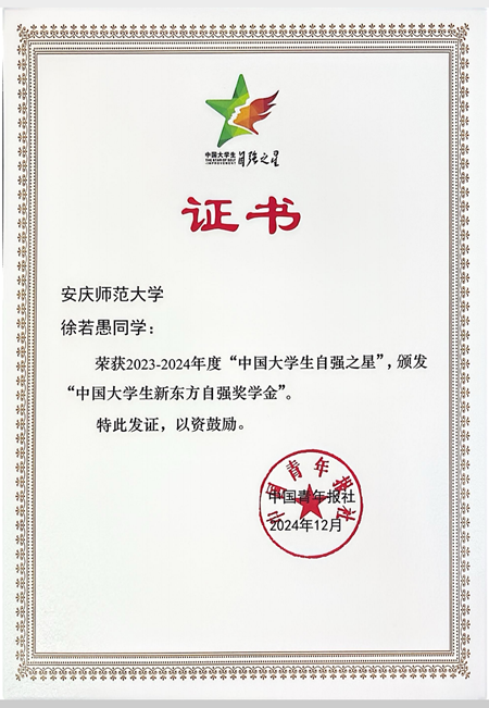 近日,由共青团中央、中华全国学生联合会联合举办的2023-2024年度“中国大学生自强之星”奖学金评选结果揭晓。beat365数理学院本科生徐若愚荣获“中国大学生自强之星”荣誉称号,并获“中国大学生新东方自强奖学金”。