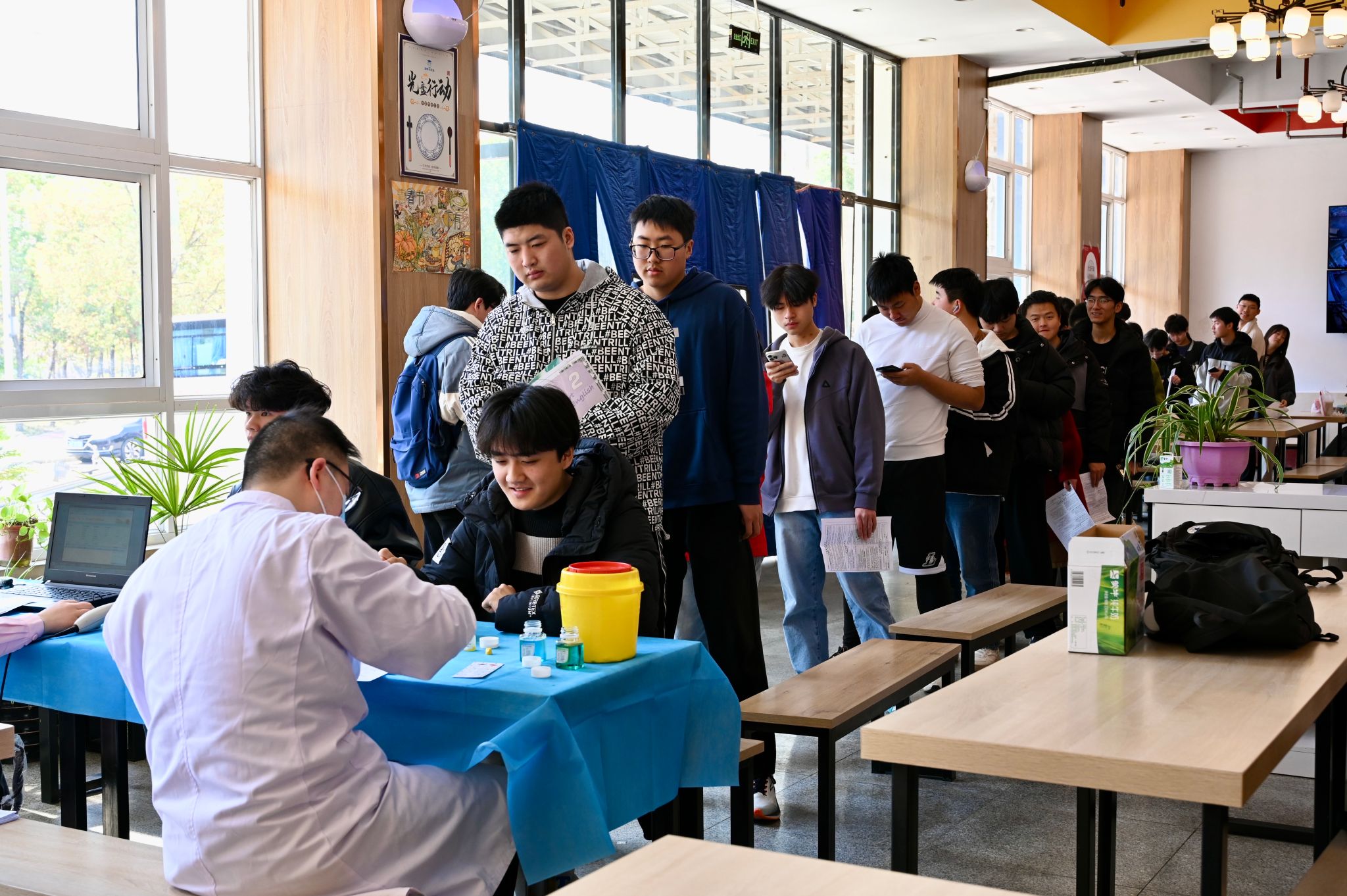 现场氛围浓厚,设有献血光荣榜、公益集市、签名墙等。活动为参与无偿献血的师生颁发《无偿献血证》《荣誉证书》,免费提供牛奶等营养品。