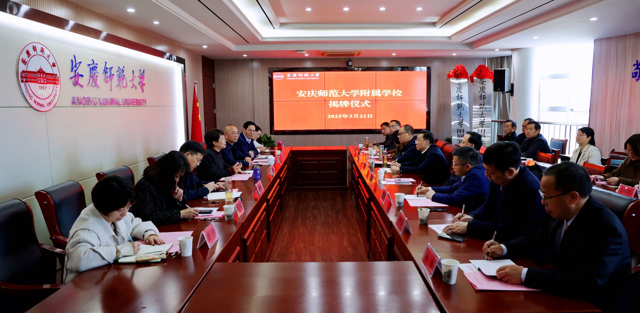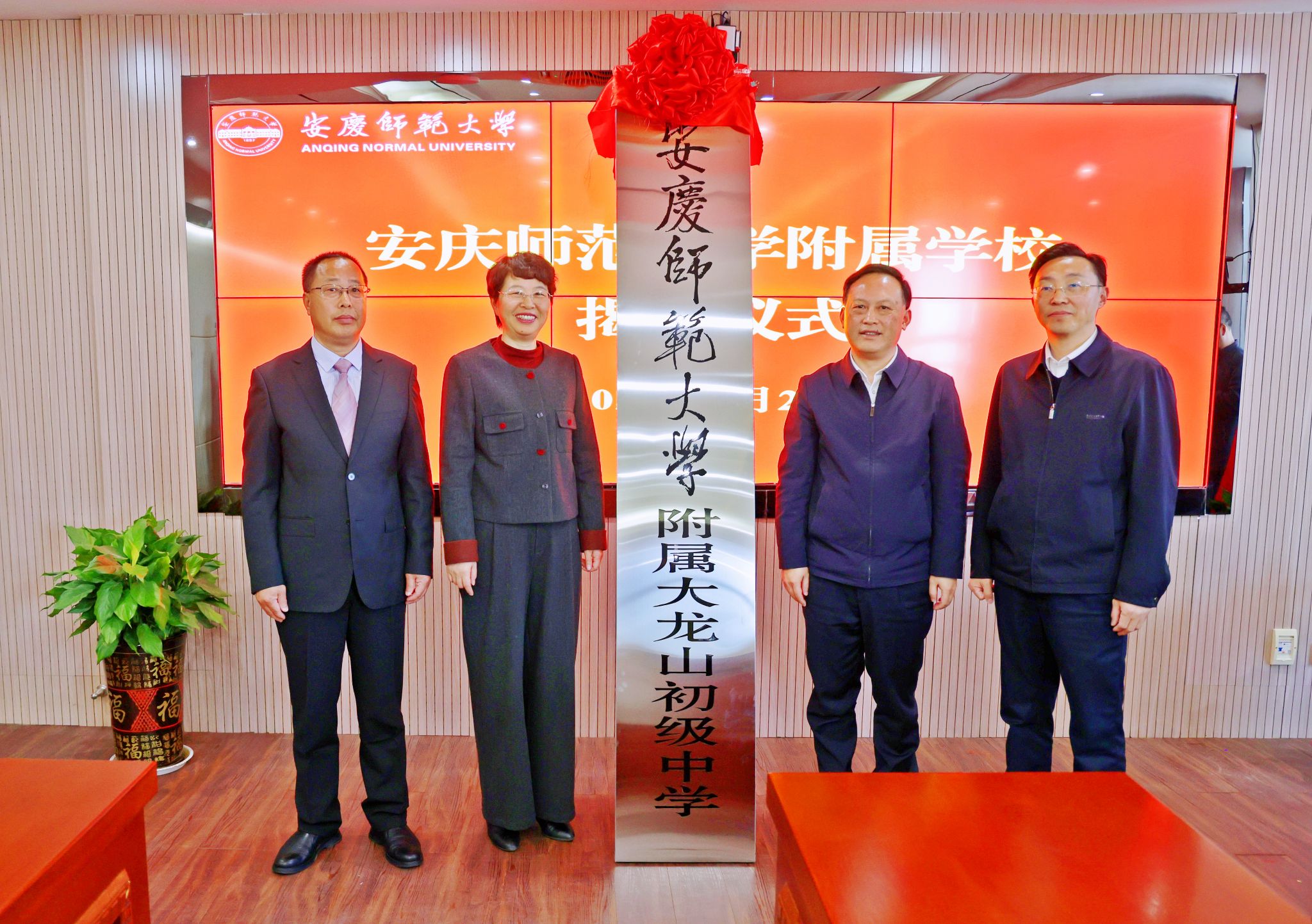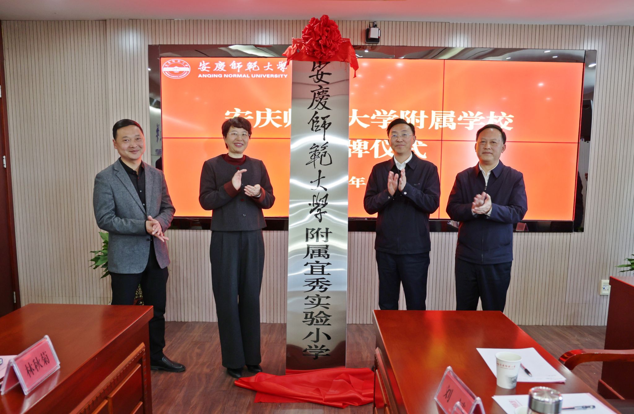 3月21日,学校与宜秀区人民政府举行beat365英国官方网站附属学校揭牌仪式。校长彭凤莲,宜秀区委副书记、区政府党组书记、区长吴曙,安庆市委教体工委书记、市教体局局长王良宜出席仪式。仪式由校党委常委、副校长肖新主持。安庆市教体局、宜秀区教体局、大龙山初级中学、宜秀区实验小学负责人,beat365人事处、教务处、服务经济社会发展处、研究生院、学生工作处和各师范专业所在学院主要负责人参加仪式。