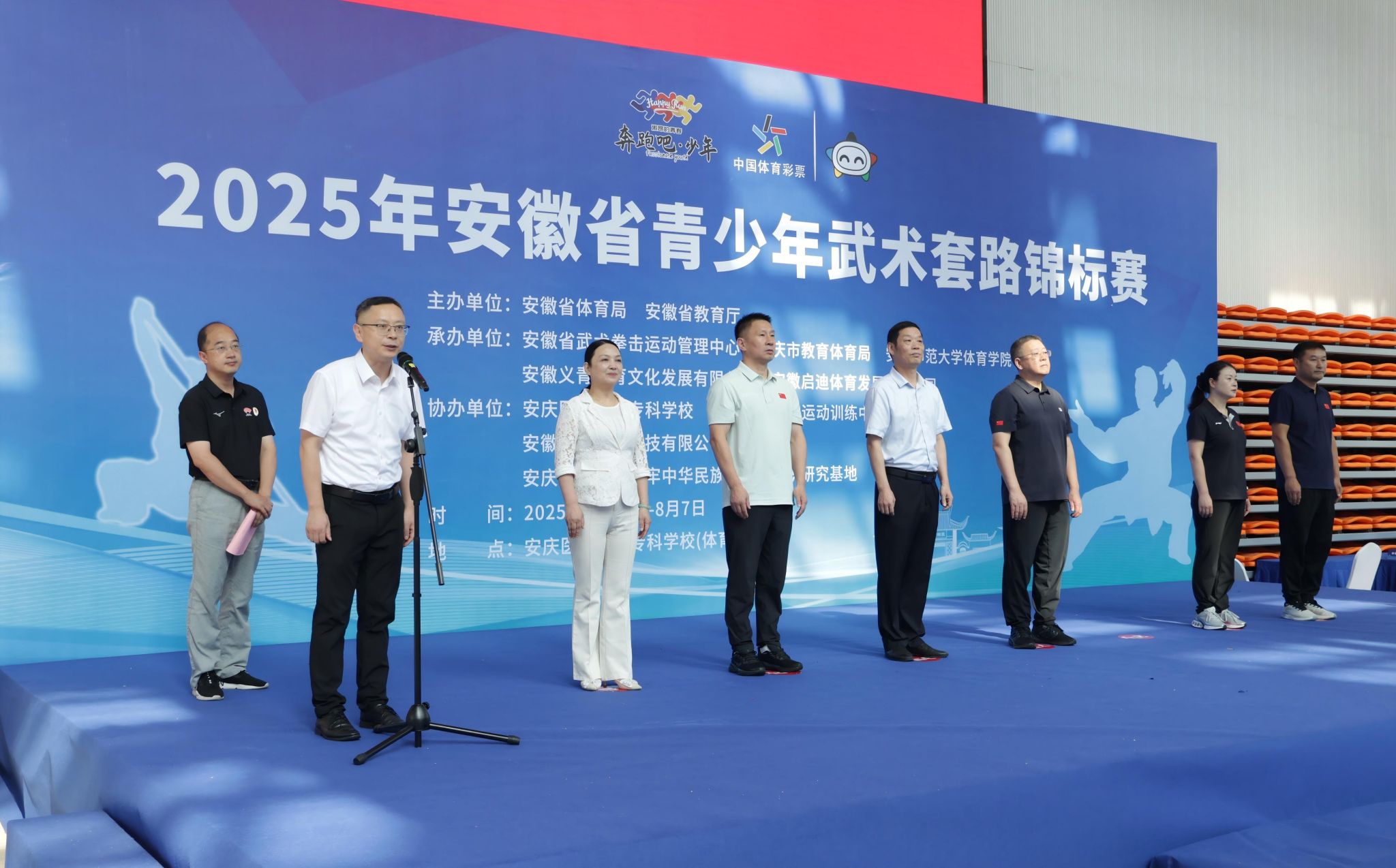 8月3日上午,由beat365参与承办的2025年安徽省青少年武术套路锦标赛在安庆医药高等专科学校体育馆举行开幕式。本次锦标赛由安徽省体育局、安徽省教育厅主办,beat365与安徽省武术拳击运动管理中心、安庆市教育体育局、安徽义青体育文化发展有限公司共同承办,安庆医药高等专科学校等单位协办。校党委常委、副校长徐晓宁,安徽省武术拳击运动管理中心党总支书记、主任魏良忠和办公室主任王晓伟,安庆市教体局副局长吴敏,安庆医药高等专科学校副校长毛以成和党委委员、党政办主任陈琪,beat365体育学院负责同志出席了开幕式。