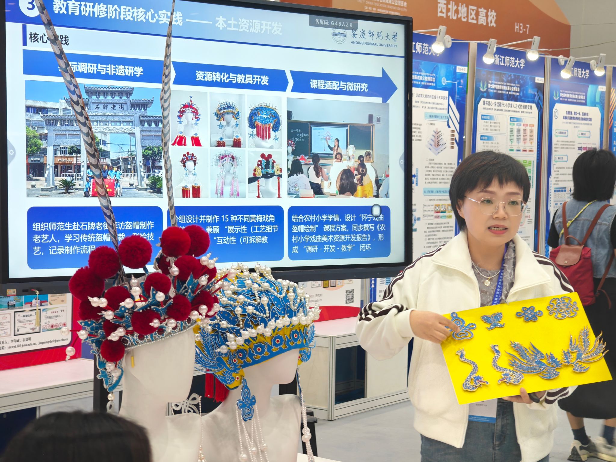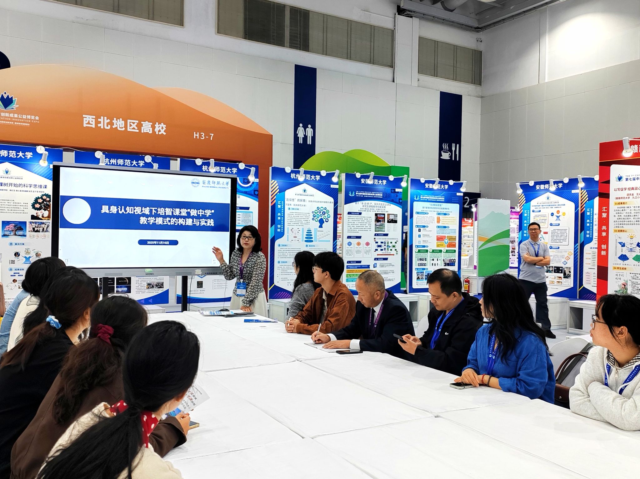 展会期间,《大别山革命老区卓越“红色园丁”培养的创新实践》《“一花一叶见艺彩”自然美育课程包---多感官本土化科学教育创新方案》《菌绘育人——中小学微生物科艺融合STEM教育体系》《智擎有机融创,赋能优化师范人才培养路径》)《基于产教融合的校企共建微专业的协同育人机制建设--一beat365英国官方网站为例》《三级联动 观察赋能:小学数学学科实践育人方式变革的区域行动样本》《具身认知视域下培智课堂“做中学”教育模式的构建与实践》《美术师范生能力分层培养“二元三阶六力”模式》等8项成果参与工作坊汇报展示,与参会嘉宾进行深入交流互动。