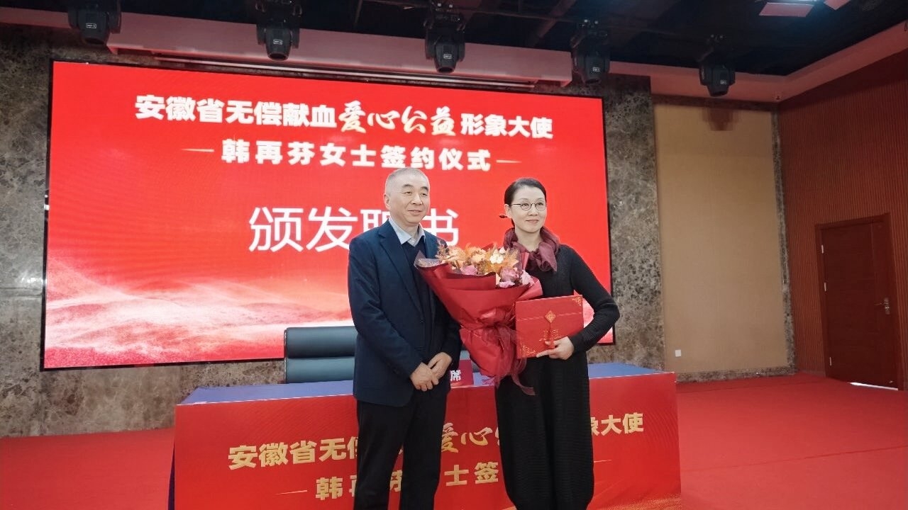 12月14日,安徽省无偿献血爱心公益形象大使聘任仪式在安徽省血液中心举行。著名黄梅戏表演艺术家、全国高校黄大年式教师团队带头人、黄梅剧艺术学院学术院长韩再芬受聘担任“安徽省无偿献血爱心公益形象大使”,为家乡无偿献血公益事业助力。