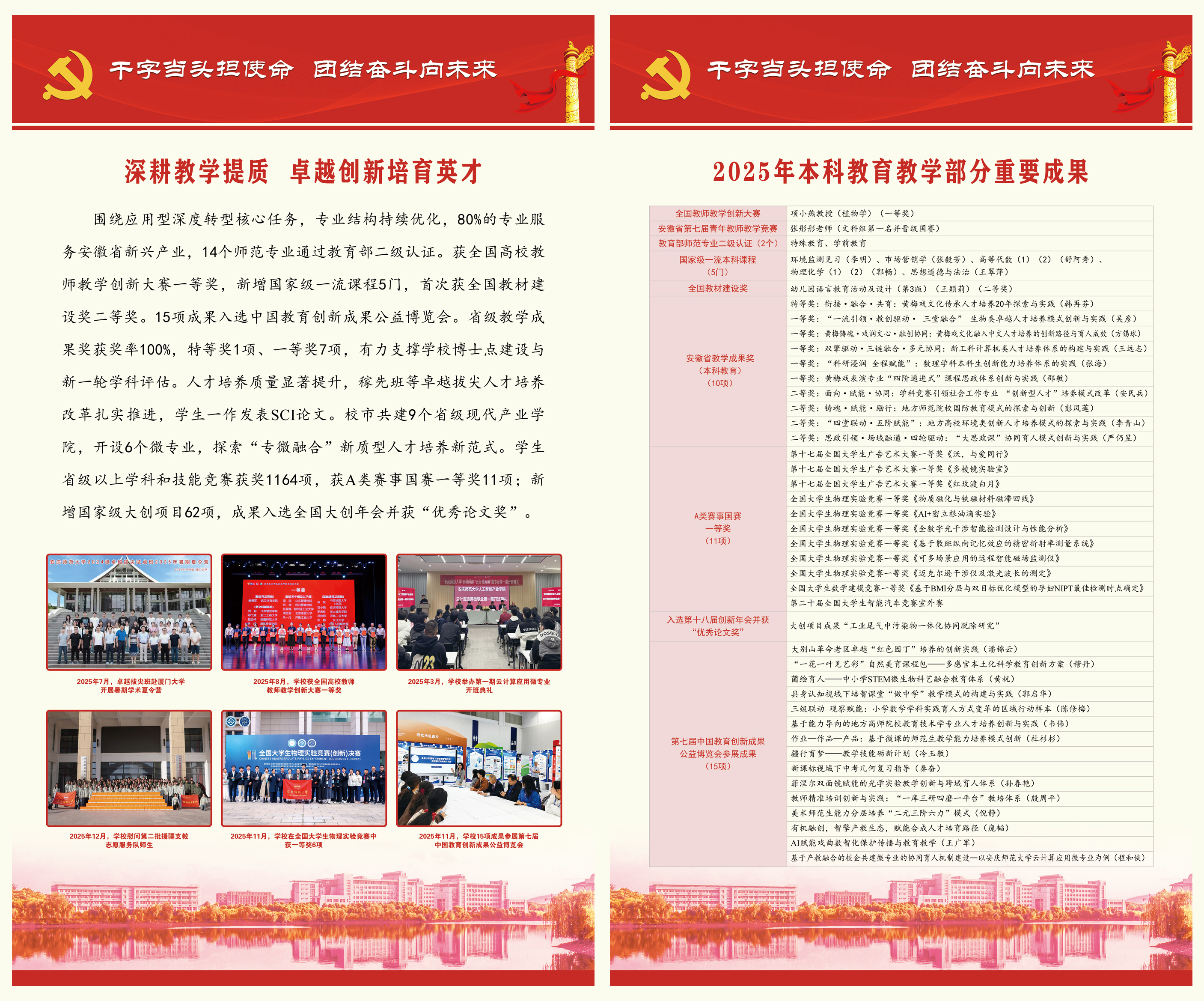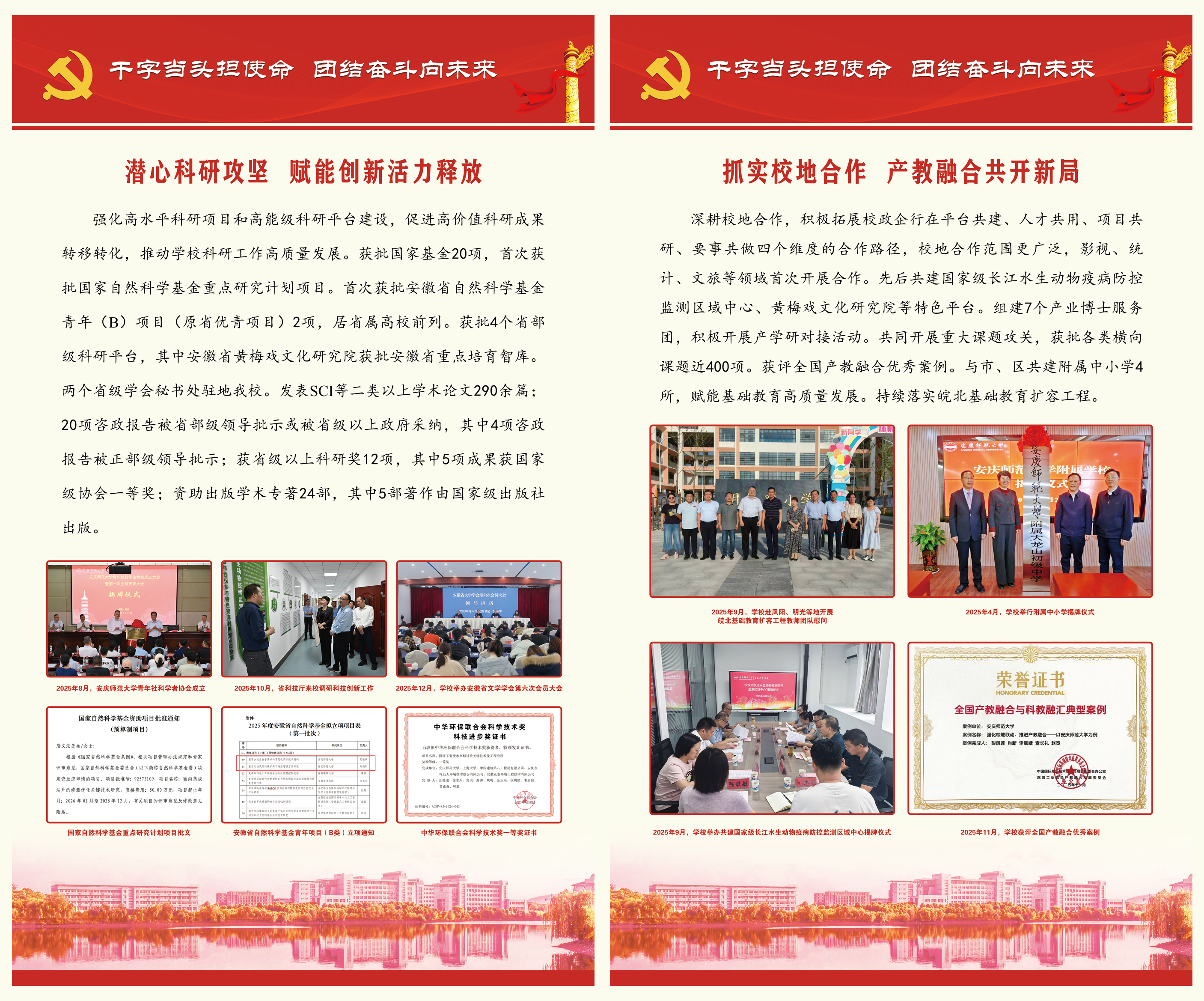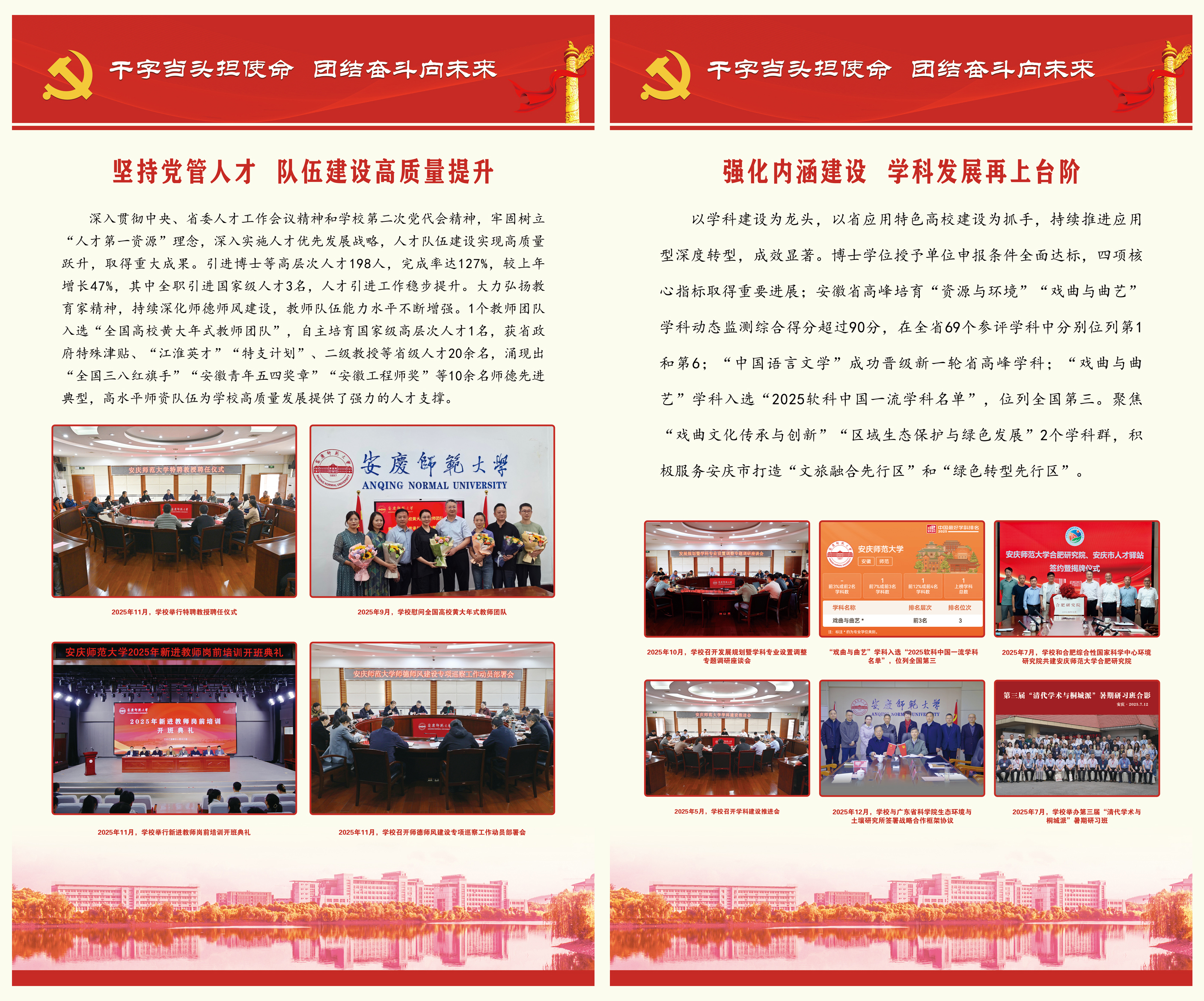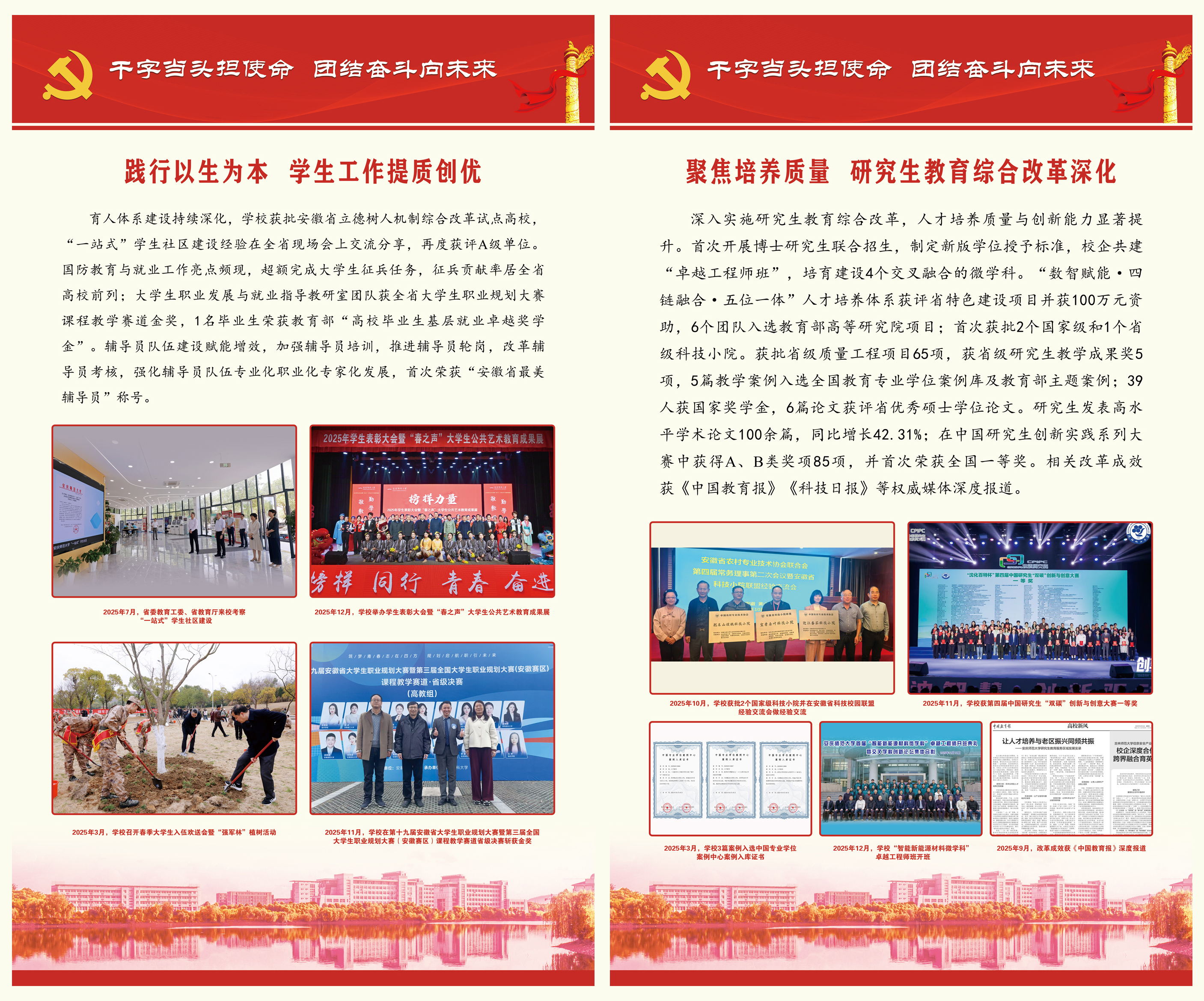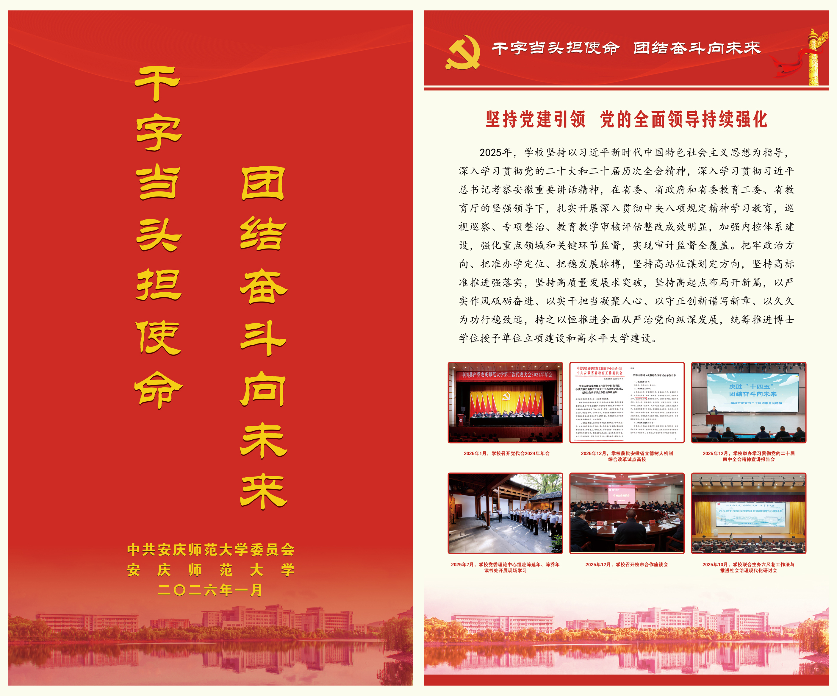 【编者按】刚刚过去的2025年,beat365英国官方网站坚持以习近平新时代中国特色社会主义思想为指导,深入学习贯彻党的二十大和二十届历次全会精神,深入学习贯彻习近平总书记考察安徽重要讲话精神,在省委、省政府和省委教育工委、省教育厅的坚强领导下,把牢政治方向、把准办学定位、把稳发展脉搏,落实落细教育强国及教育强省建设各项任务,坚持以高质量党建引领高质量发展,持之以恒推进全面从严治党向纵深发展,统筹推进博士学位授予单位立项建设和高水平大学建设,圆满完成2025年目标任务。2026年是中国共产党成立105周年,是“十五五”开局之年,也是学校坚决打好博士点立项建设攻坚战、推进向应用型深度转型的关键之年。全体师生员工要以更强担当、更优作风,推动“十五五”发展开好局起好步,保持马不停蹄的干劲,在寒来暑往的坚守中,在春华秋实的耕耘中,共同书写学校高质量发展的新篇章,共同奔赴安庆师大的美好明天。