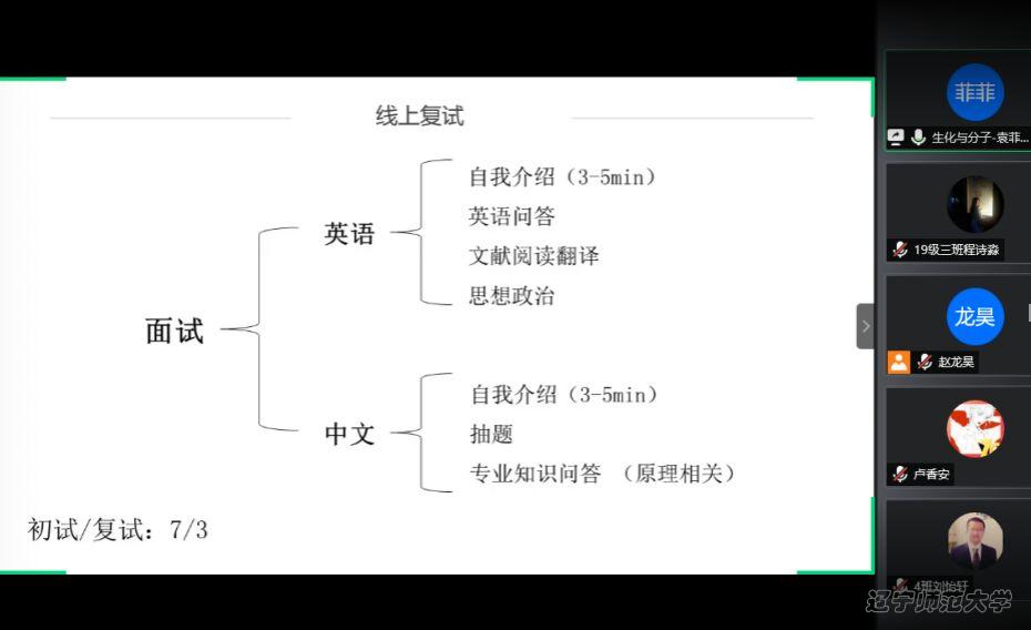 6月8日晚上6:30,pg国际通过腾讯会议APP举办线上“开往春天的地铁”考研指导与经验分享交流会之华东师范专场。本次交流会的主讲嘉宾有2016级生物科学(师范)专业张楷文同学、2016级生物科学(师范)专业王晓凤同学以及2016级生物科学(师范)专业袁菲菲同学。本次交流会由学习部干事宋芊芊主持,2017级、2018级、2019级部分同学参加本次交流会。