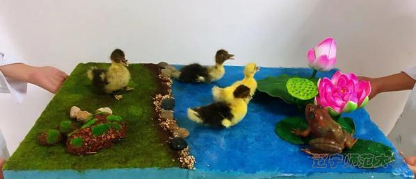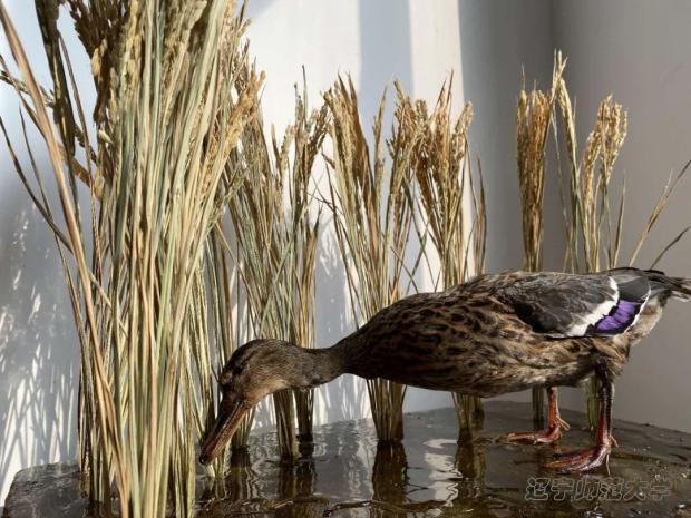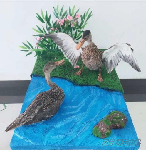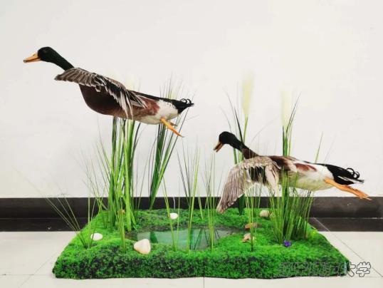 本次作品我们选用的是一种绿头鸭,标本中的两只鸭均为雄鸭,上体黑褐色,腰和尾上覆羽黑色,两对中央尾羽亦为黑色,且向上卷曲成钩状;外侧尾羽白色,胸栗色。本次作品的灵感来源于苏轼的一首《惠崇春江晚景》,在春天到来之际,鸭子用行动感知春的讯息,守护着这片绿地,而春天的大地也为鸭子提供了完美的栖息地。绿水青山就是金山银山,自然与生物互相影响,我们希望通过这个作品呼吁大家与自然和谐相处,守护自然。