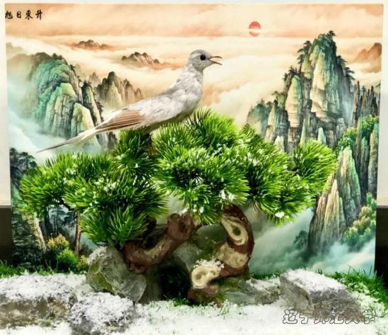 标本的主体是一只澳大利亚蓝白尾雪鸽,又名珍珠鸽。上背褐灰,翼灰黑色,尾灰白,中间部位具蓝色带。一般栖息于海拔高处以及出没于岩石和土坎徒壁上及河谷岩坡间。正如面对突发疫情的钟南山院士临危受命,守在抗疫第一线。雪鸽栖息于南山上,在大雪纷飞的季节里仍放声高歌,用自己嘹亮的歌声驱走冬天的严寒和阴霾。没有一个冬天不会过去,旭日东升,冰雪消融,雪鸽巍然挺立于南山之上。