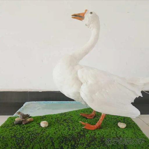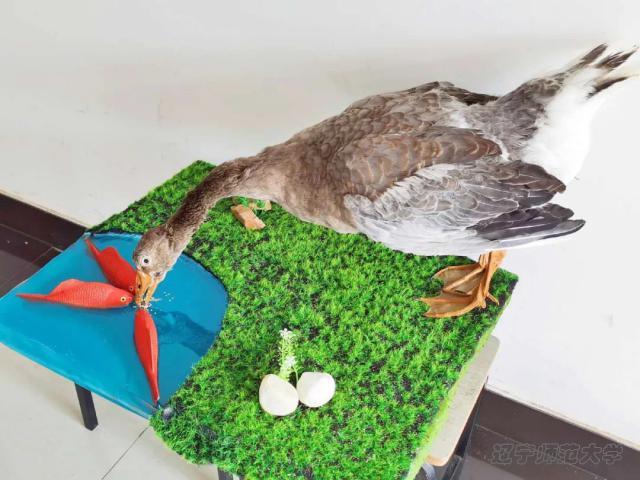 标本主体是一只朗德鹅 。它的毛色灰褐,颈部、背部接近黑色,胸部毛色较浅,呈银灰色,腹下部则呈白色,在公园里,我们经常看到鹅喂鱼的温馨画面,但这些鹅并不是有意的。因为鹅吃的饲料是属于一种水分含量较少的干性颗粒饲料,它们每一次叼起食物都要放进水中,使食物遇水软化后才容易咽下。这时,就会有不少饲料从它嘴边飘落到湖水中,守候在旁边的锦鲤鱼就能享受到美味的饲料了。所以,每到给鹅喂食物的时候,就会出现鹅与锦鲤“亲吻”的“温馨”时刻了。