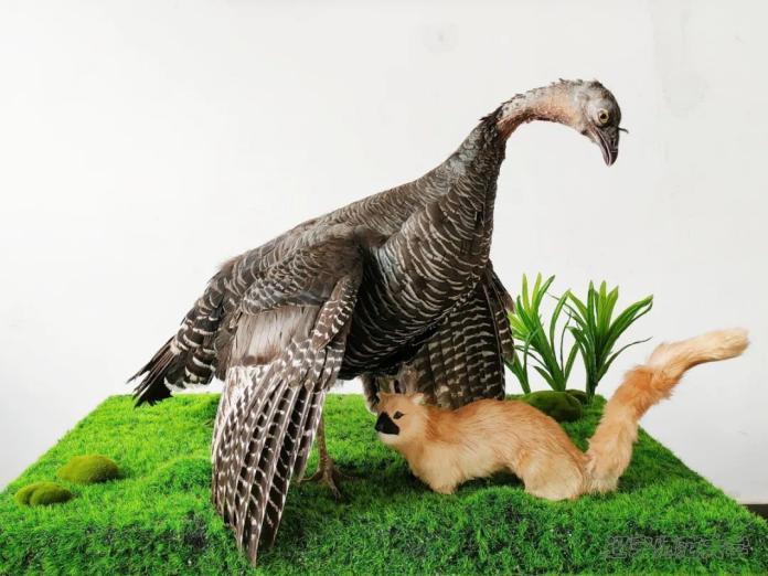 标本展示了动物学家M·W·Fox做的实验,生动地展示了雌火鸡对小火鸡叫声的依赖性。对雌火鸡来说黄鼠狼是它的天敌,正常情况下雌火鸡会对黄鼠狼展开攻击,哪怕是一个黄鼠狼的玩具站在雌火鸡面前,雌火鸡也会疯狂地攻击它。但如果将小火鸡的叫声放在黄鼠狼玩具中,播放小火鸡的叫声,雌火鸡不光会接受黄鼠狼玩具,还会将黄鼠狼玩具收拢到自己的羽翼下。雌火鸡热情的拥抱自己的天敌,仅仅是因为它发出了小火鸡的叫声。大多数物种包括人类都有这种盲目而机械的规律性行为模式。如何突破这种固定行为模式引人深思。