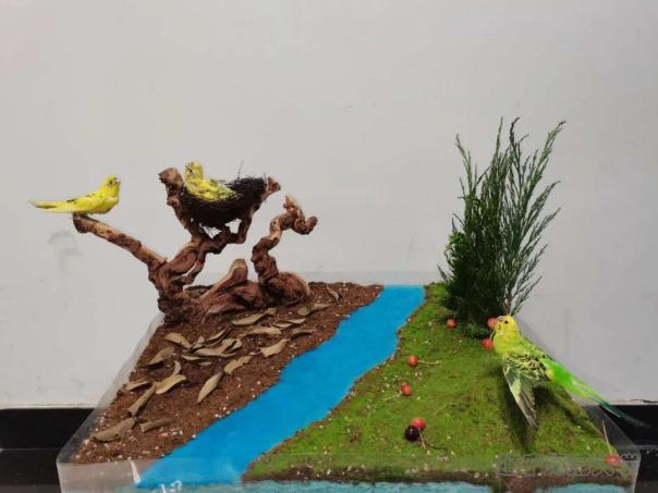 本作品主要动物材料为鸟纲鹦形目的鹦鹉,以一条河流为界限,将鸟类的生活环境分成两部分,一边是鹦鹉在河水清澈,草地茂盛,食物充足的环境中生活,另一边则是一只雌鸟在土地荒芜,缺少食物的环境中艰难地觅食,养育在枯木的巢中嗷嗷待哺的孩子。两边环境形成鲜明对比,旨在突出人类的行为可能对鸟类的生活环境产生的巨大影响。人类作为食物链顶端的生物,应该对其他生物的生存发展负责,在做出任何行为之前都应该思考可能对其他生物和大自然产生的影响。这样不但是在保护大自然,更是在保护人类自己。