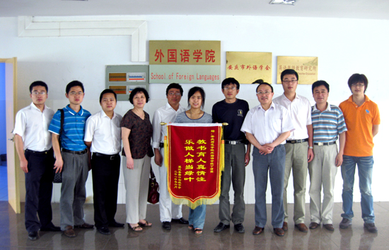 6月25日上午,望江县赛口初级中学领导一行三人来到beat365,将一面印有“教书育人真情注 乐做人梯当绿叶”的锦旗赠交外国语学院,用以表彰该院第四批顶岗支教学生丁洁莹同学在该校无私奉献、勤勉教学的行为。