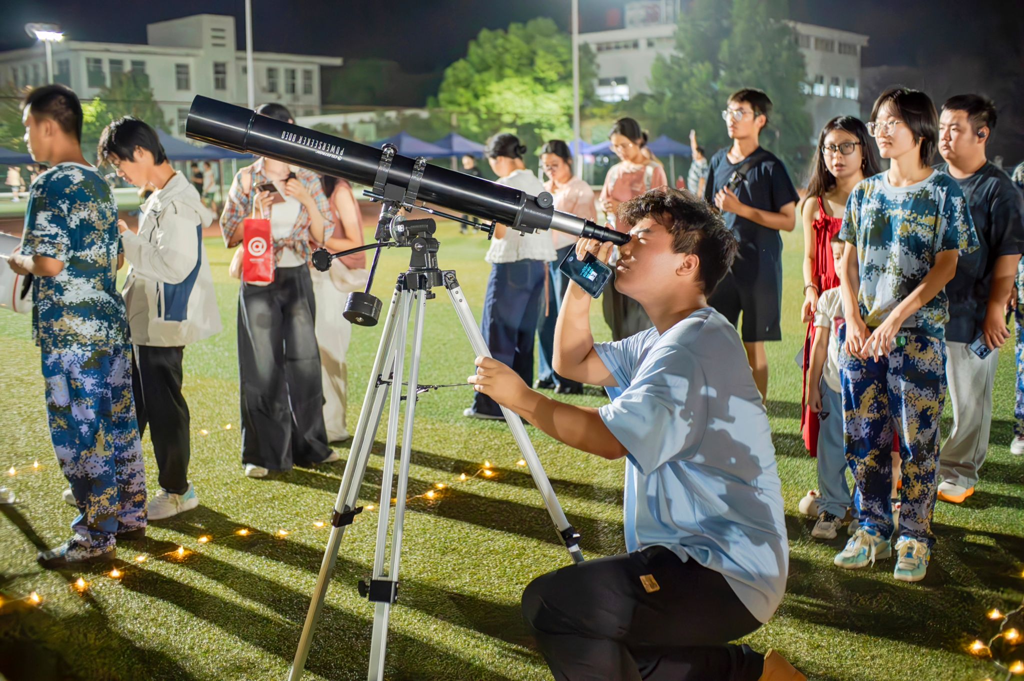 “‘摘星捧月’安排!”“合唱跳舞这就来!”9月27日晚,东门操场草坪上的直播镜头里,beat365英国官方网站数理学院的主播正在与观众们热情互动,学校第三届“中秋之夜”大型主题活动的序幕就此拉开。这场由数理学院团委和大学生天文爱好者协会主办、其他12个协会协办的活动以“迎中秋、庆国庆”为主题,吸引5000余名师生齐聚于此,在天文观测的震撼与中华传统文化的浸润中,共赴一场国庆和中秋欢庆之约。