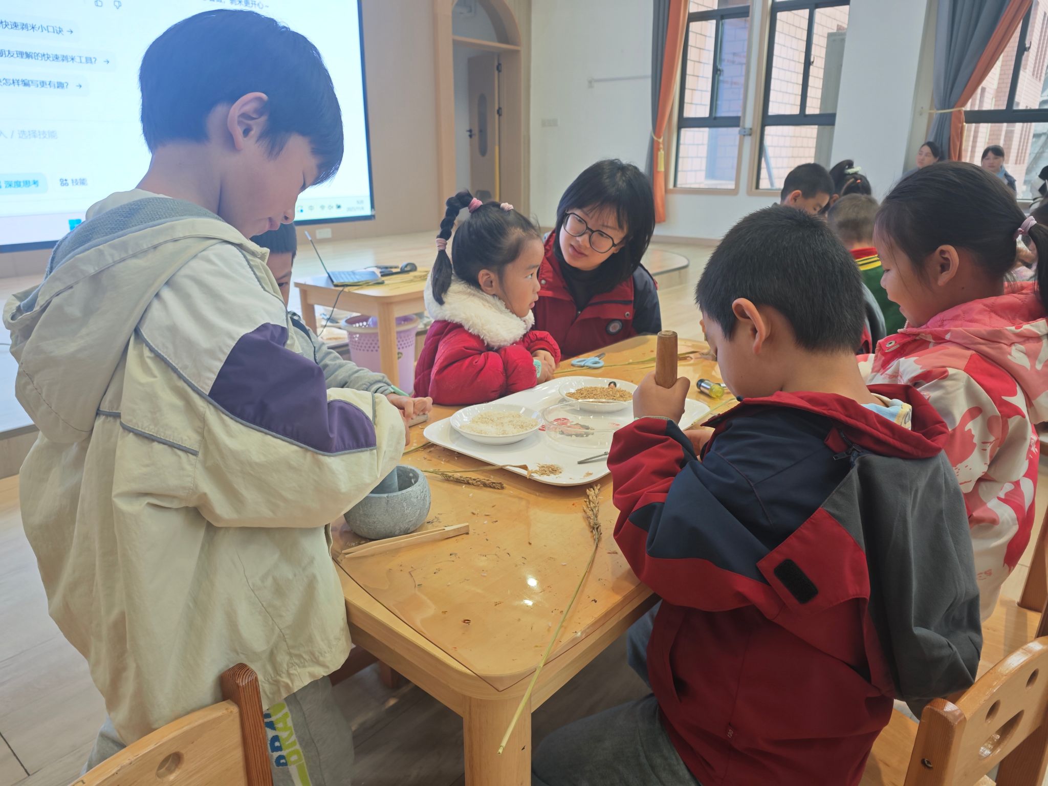 李倩老师执教中班美术活动《秋天的树叶》,以秋天的树叶为核心素材,设计拓印、剪贴等美术操作环节,幼儿在动手实践中不仅认识了不同树叶的形状特征,更在色彩搭配与创作中直观感知秋天色彩的丰富多样;林晨老师的大班科学活动《稻谷变变变》融合实物观察、工具操作、AI互动等多元形式,通过近距离观察稻谷、亲手操作碾米工具,再借助AI演示,掌握了“稻谷→米→粉”的变化过程。