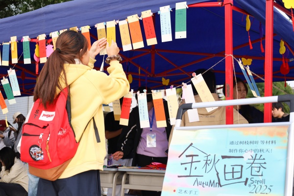 在旁边的“金秋笺语,尺素传心”摊位前,信封、书签与明信片整齐摆放。“这是我第一次写信,收信人是我的母亲。”数据科学与大数据技术专业2022(2)班的郑庆元手持信封,在谈及选择写信这一方式的缘由时表示,如今日常沟通便捷高效,但书信传递情感的方式独具温度与意义——这种慢下来的交流对双方而言都是一种新奇体验。同时他希望借着这份特别的心意,为母亲送上一份意外的惊喜。