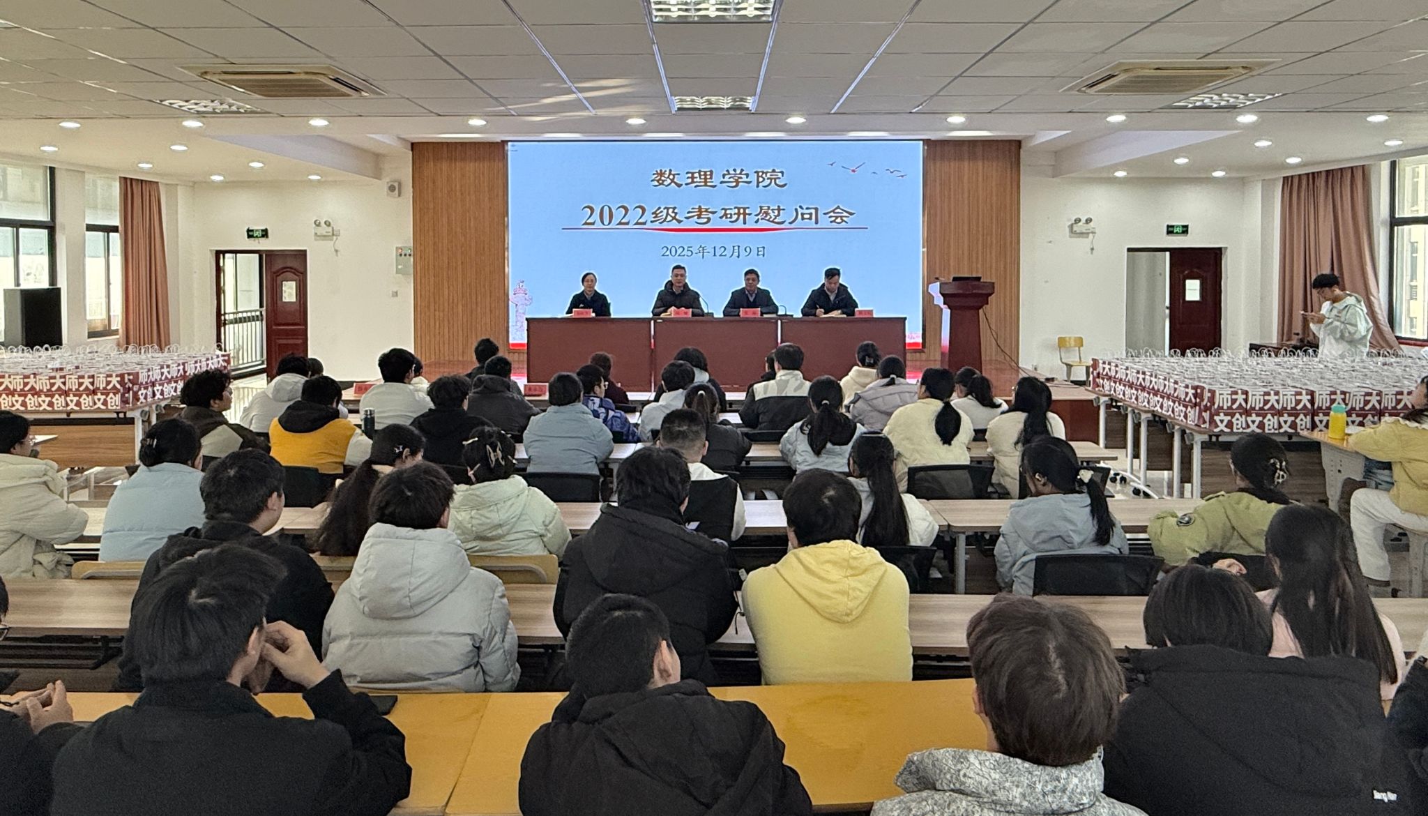 12月9日,数理学院在I楼401报告厅举办2026届考研学生慰问会。数理学院党委书记陆健、院长张海、副院长易明芳,院长助理陈文兵,各专业负责人、2022级辅导员及考研学生代表参加。慰问会由陆健主持。