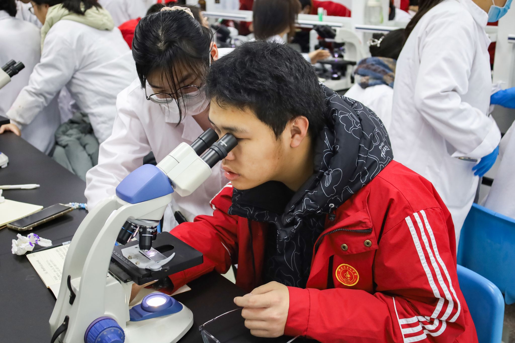 取材、解离、漂洗……从制作标本到观察细胞形态,在生命科学学院教师江转转和“小老师”的带领下,高中学生们亲身参与有丝分裂显微观察实验,将课本知识运用于实践操作。