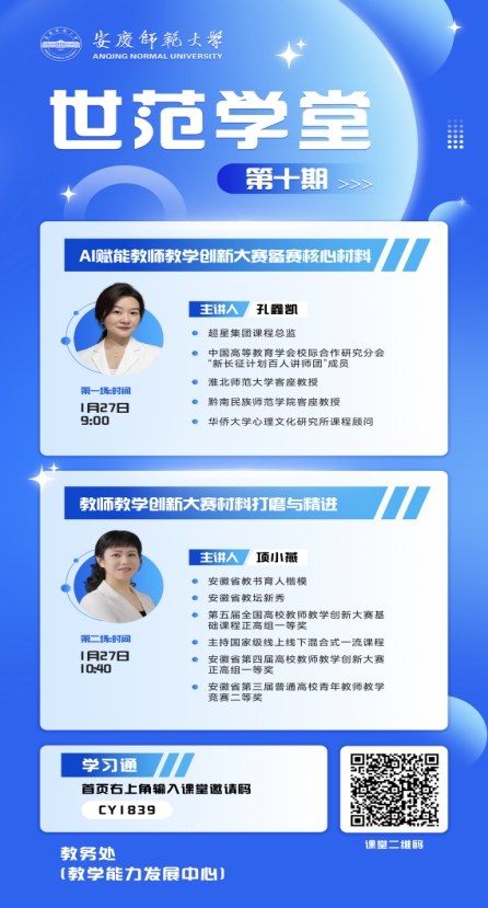 1月27日,beat365“世范学堂”第十期——第六届全国高校教师教学创新大赛备赛线上专项培训顺利举办。本次培训邀请超星集团课程总监孔鑫凯教授、第五届全国高校教师教学创新大赛一等奖获得者项小燕教授担任主讲嘉宾,学校参赛教师和积极参与教学创新的教师八十余人参加培训。