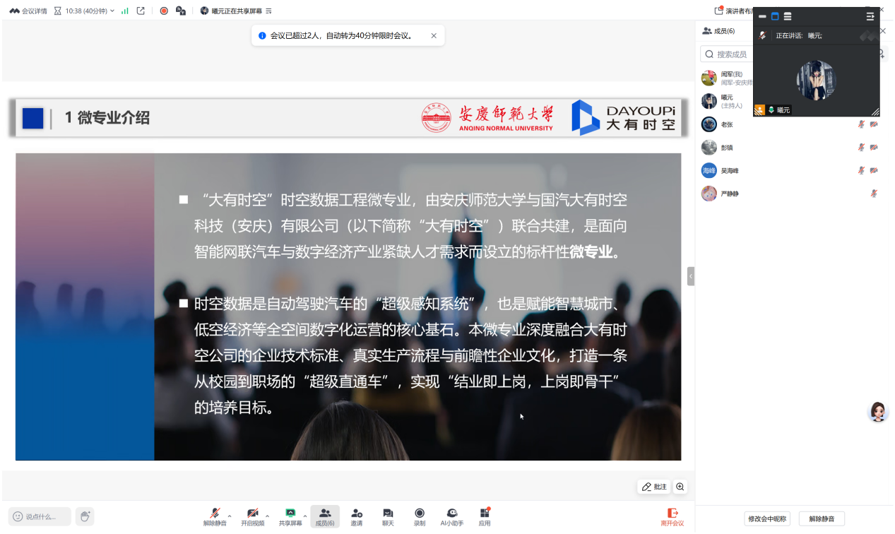 本次会议的召开,标志着“大有时空”时空数据工程微专业建设进入实施阶段,进一步明确了建设方向、细化了工作任务。下一步,计算机与信息学院将持续深化产教融合、协同育人机制,着力打造具有示范意义的“人工智能+”微专业群,不断提升人才培养质量,为区域智能网联汽车、数字经济等相关产业高质量发展输送更多高素质技术技能人才。(撰稿:张曦元 编辑:田梦甜 审核:吴海峰 赵丽丽)
