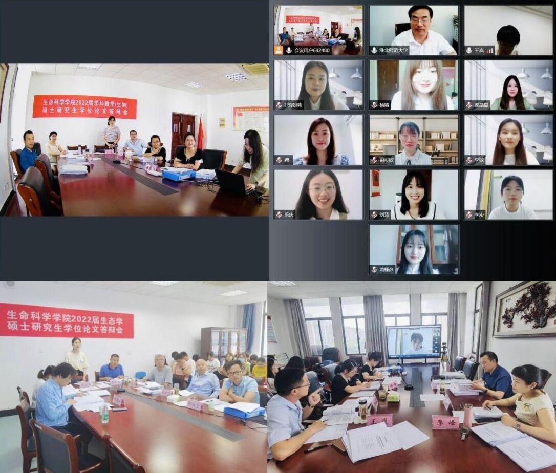 6月1日,生命科学学院在G411和G402会议室分别举行了2022届生态学和学科教学(生物)硕士研究生学位论文答辩。学院邀请安徽师范大学生态与环境学院严云志教授担任生态学答辩委员会主席,淮北师范大学生命科学学院李峰教授和合肥市第五中学特级教师王岚分别担任学科教学(生物)答辩委员会主席和副主席,学院周多奇教授、吴甘霖教授、于道平教授、魏和平副教授和尹立伟副教授担任生态学答辩委员会委员,吴彦教授、项小燕教授、穆丹教授、李从虎副教授担任学科教学(生物)答辩委员会委员。2019级生态学7名研究生和2020级学科教学(生物)11名研究生通过线下或线上方式参加了答辩,全体在校硕士研究生和研究生导师到场观摩学习。