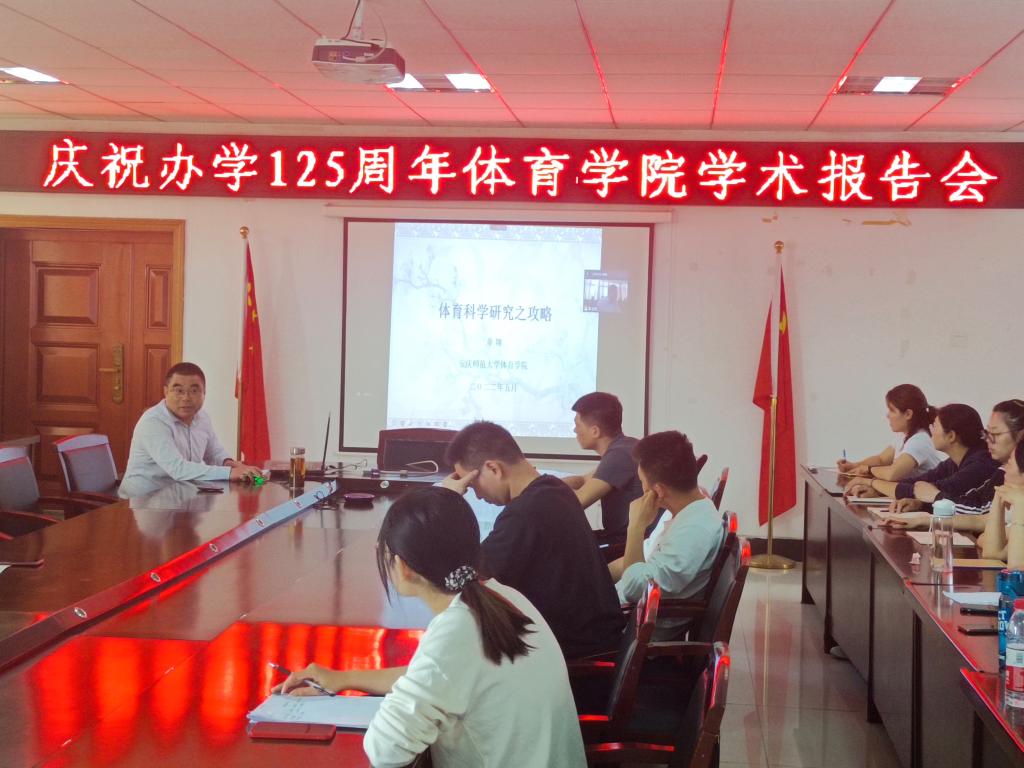 为庆祝beat365英国官方网站办学125周年,搭建学院高层次学术交流平台,提高师生科研创新能力,营造良好的学术风气和浓厚的学术氛围,结合当前新冠肺炎疫情防控要求,5月15日下午,在体育学院三楼会议室,体育学院院长章翔教授采用“线上+线下”混合式方式,为部分教师和体育学专业全体研究生作了题为“体育科学研究之攻略”的学术报告。