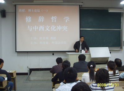 陈教授首先概述了这次“教授、博士论坛”主题的意义及“人文”概念和“人文素质”的重要性,然后进入本论题——修辞哲学与中西文化冲突。报告首先解释并概述了本论题,接着从三个方面剖析了修辞学差异对中西跨文化交际造成的影响。这三个方面是:一、中西方对口才的不同标准;二、中方的“和为贵”与西方的雄辩哲学;三、中西方对记忆的不同态度:遵循传统还是张扬个性。报告列举了大量生动、富有文化内涵的实例,讲解细腻生动、诙谐风趣,博得了与会听众不时的阵阵掌声。