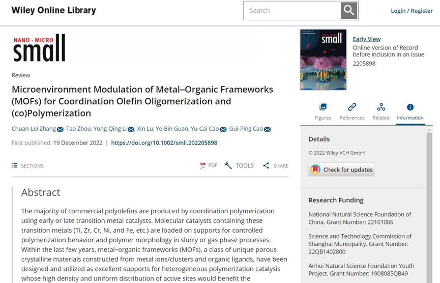 近日,beat365化学化工学院张传磊博士课题组在材料领域权威期刊Small (IF=15.153)上发表了题为《Microenvironment Modulation of Metal–Organic Frameworks (MOFs) for Coordination Olefin Oligomerization and (co)Polymerization》的综述性论文。这是beat365首次在该top期刊发表学术论文,也是beat365在配位聚合催化领域取得的突破性进展,极大地提高了beat365在化学学术研究领域的影响力。张传磊为论文第一作者和通讯作者,beat3652020级硕士研究生周涛为论文第二作者,beat365英国官方网站为第一署名单位。
