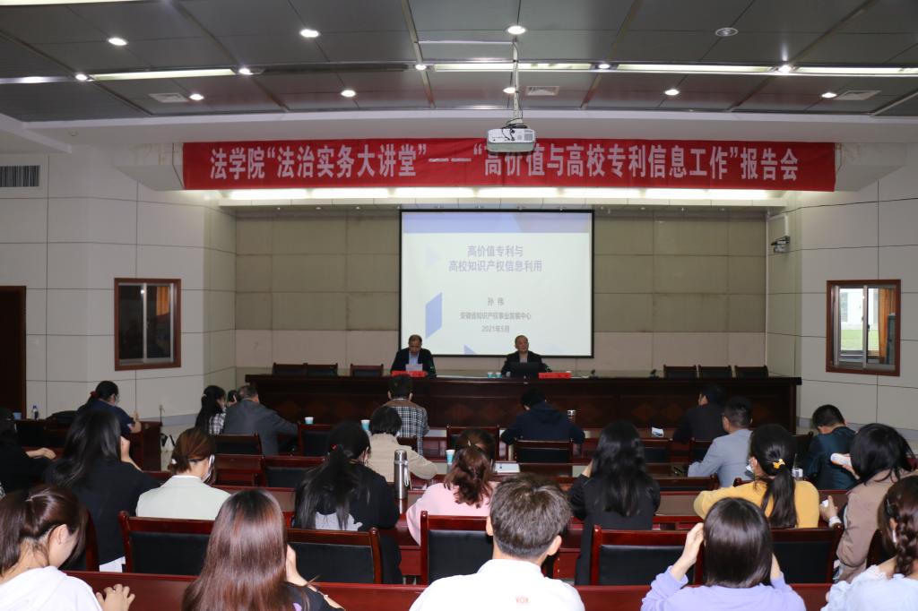 本次报告会是在校五月活动月之际,由校科研处、法学院共同举办的。法学院等师生及安庆市知识产权局部分领导近200人参加了报告会。报告中,孙伟教授对我省高价值专利现状进行了详细的分析,针对高校知识产权管理和高校知识产权信息利用提出建议。随后,孙伟老师从我省高价值专利数量排名情况、各市发明专利对比情况、安庆市申请专利数量以及beat365专利数量等方面对我省高价值专利现状进行了详细的分析;最后,孙伟老师针对高校知识产权信息利用提出了加快建立职务科技成果披露制度、提升专业化服务能力、大力提倡通过普通许可方式开展科技成果转化等建议。