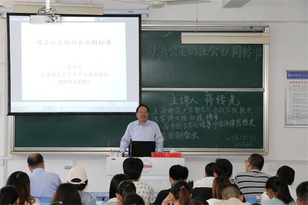 5月29日下午,在文津楼405教室,上海师范大学哲学与法政学院院长、博士生导师蒋传光教授来校作“司法公正的社会认同标准”为主题的学术报告。法学院院长焦少林教授主持此次报告,法学院部分教师和2017级、2018级共130余人聆听了报告。