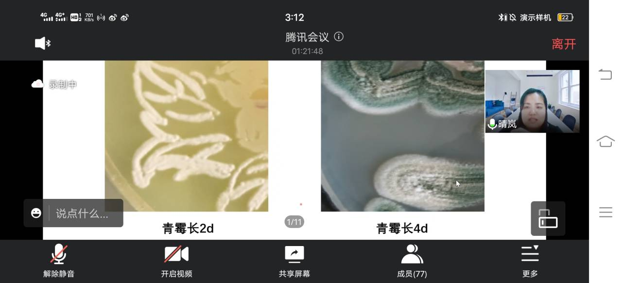 交流会上,郑爱芳还进行了线上互动答疑,针对不同微生物绘画作品采用的各类菌种、绘制与处理方法、注意事项同与会师生进行了交流分享。“为什么同一种菌最后颜色不同?”“如何控制霉菌的生长?”“微生物平皿画可以保存几天?”……现场提问环节气氛热烈,郑爱芳耐心地进行了专业的解答,受到与会师生的一致好评。