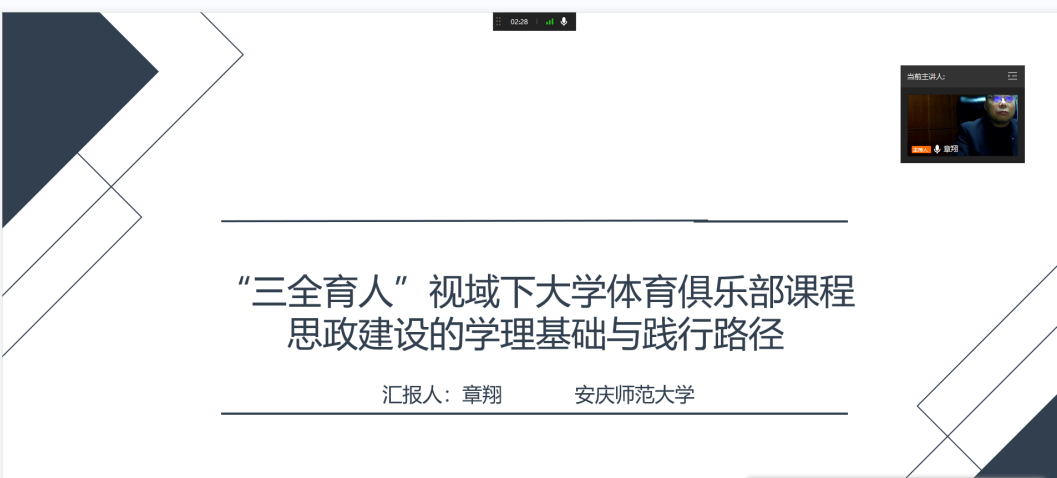 本次大会交流形式为大会采取“小线下,大线上”的形式,设有日照主会场和北京分会场。根据大会安排,3月25日,章翔教授在线上作了题目为《“三全育人”视域下大学体育俱乐部课程思政建设的学理基础与践行路径》的专题报告;宣暄老师作了题目为《第18届男篮世界杯中国男篮攻防能力RSR分析》的专题报告。另外,王晓东博士的《俞子箴体育思想研究》、胡哲纯老师的《健康中国视域下安徽省运动休闲特色小镇发展路径研究》以及张书军老师的《体验:武术文化传承路径研究》作为墙报交流被本次大会收录。