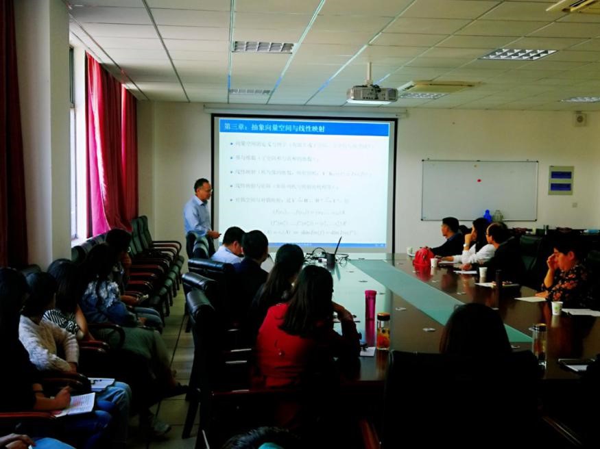 报告中,孙笑涛教授结合多年来的教学实践,向老师们分享了有关代数教学及课程建设的思考及体会,详细介绍了线性代数和抽象代数核心内容的教学方法,并给出了一些重要定理以及线性代数的具体应用。孙教授鼓励青年教师增强自身的教研意识,把科学研究和课堂教学结合起来,提高教学质量和教学效果。