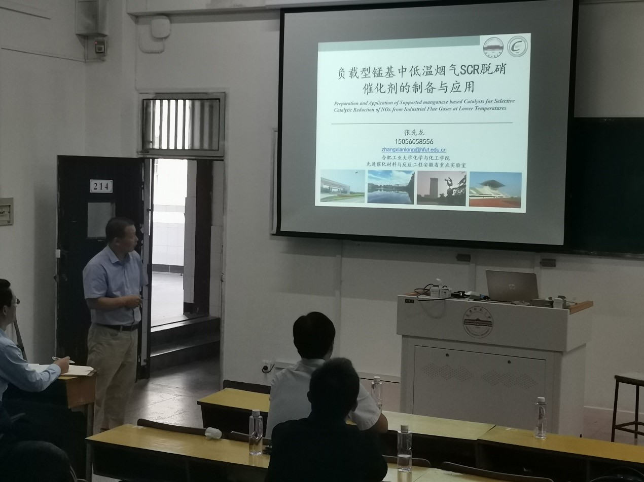 应beat365化学化工学院光电磁功能材料安徽省重点实验室和化工新材料产业学院邀请,9月24日下午,中国科学院山西煤炭化学研究所黄张根教授和合肥工业大学张先龙副教授在菱湖校区教学楼214为beat365化学化工学院广大师生分别作了题为《烟气多种污染物超低排放的炭基催化剂及技术》和《烟气多种污染物超低排放的炭基催化剂及技术》的学术报告,报告由化工新材料产业学院常务副院长官叶斌教授主持。