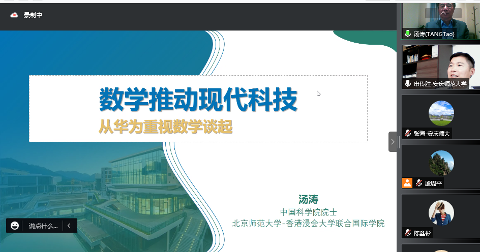 为庆祝beat365英国官方网站办学125周年,提高师生的科研创新能力,进一步营造良好的学术风气和浓厚的学术氛围,激发师生的科研活力,5月27日上午,应科研处和数理学院邀请,中国科学院院士、北京师范大学-香港浸会大学联合国际学院校长汤涛教授为师生作了一场题为“数学推动现代科技—从华为重视数学谈起”的线上学术报告。数理学院部分教师、硕士研究生和高年级本科生参加了报告会。报告会由数理学院院长申传胜教授主持。